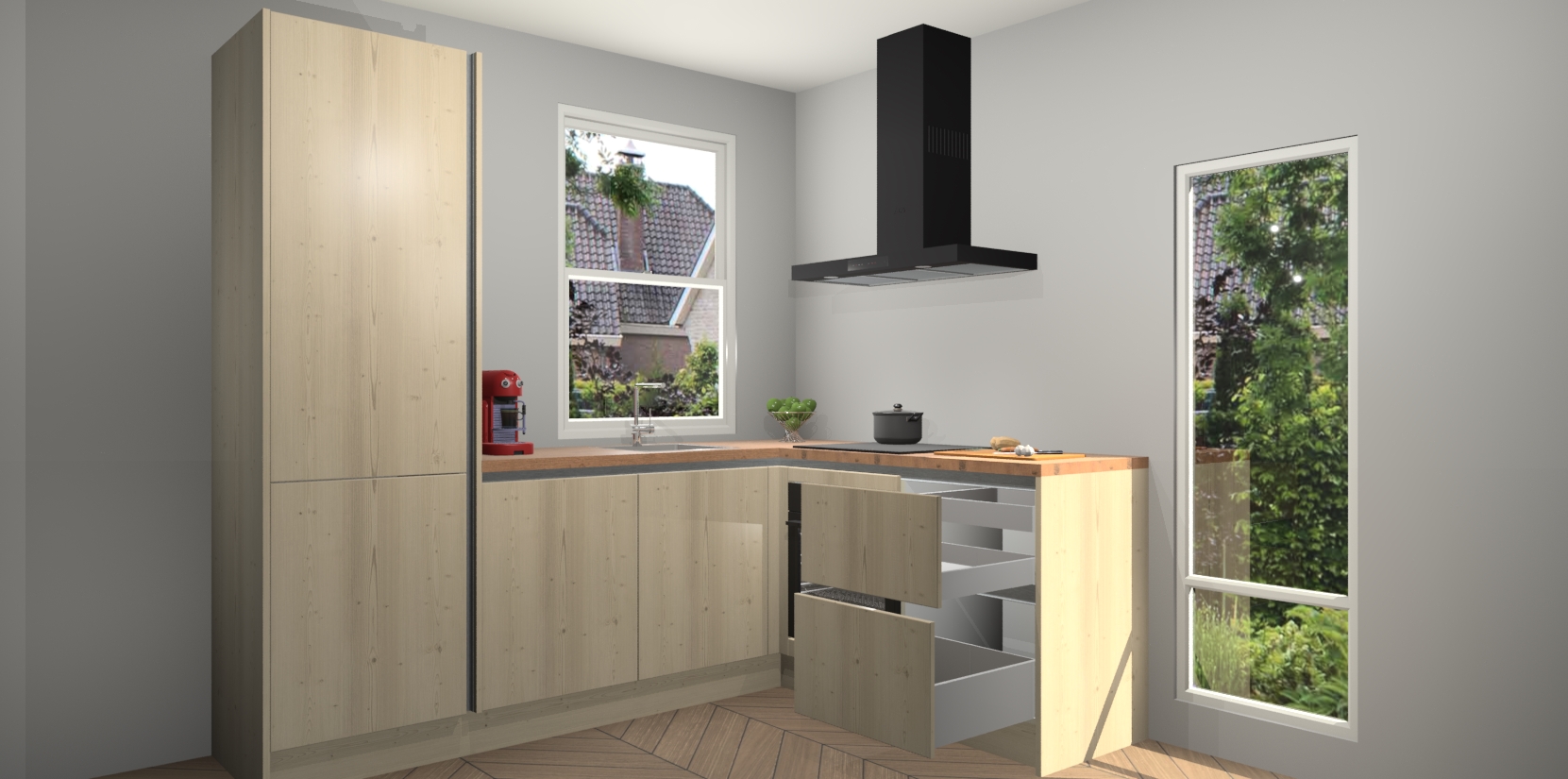De prachtige Vuren greeploze keuken Phuket is de perfecte keuze als u op zoek bent naar een moderne hoekkeuken met alle luxe en comfort die u kunt verwachten! De uitstraling in het houtlook-design draagt bij aan de warme sfeer die u nu al voelt wanneer u er naar kijkt. Heeft u genoeg van ouderwetse keukens? Probeer dan direct deze moderne, mooie hoekkeukens en laat iedereen verbluft achter!