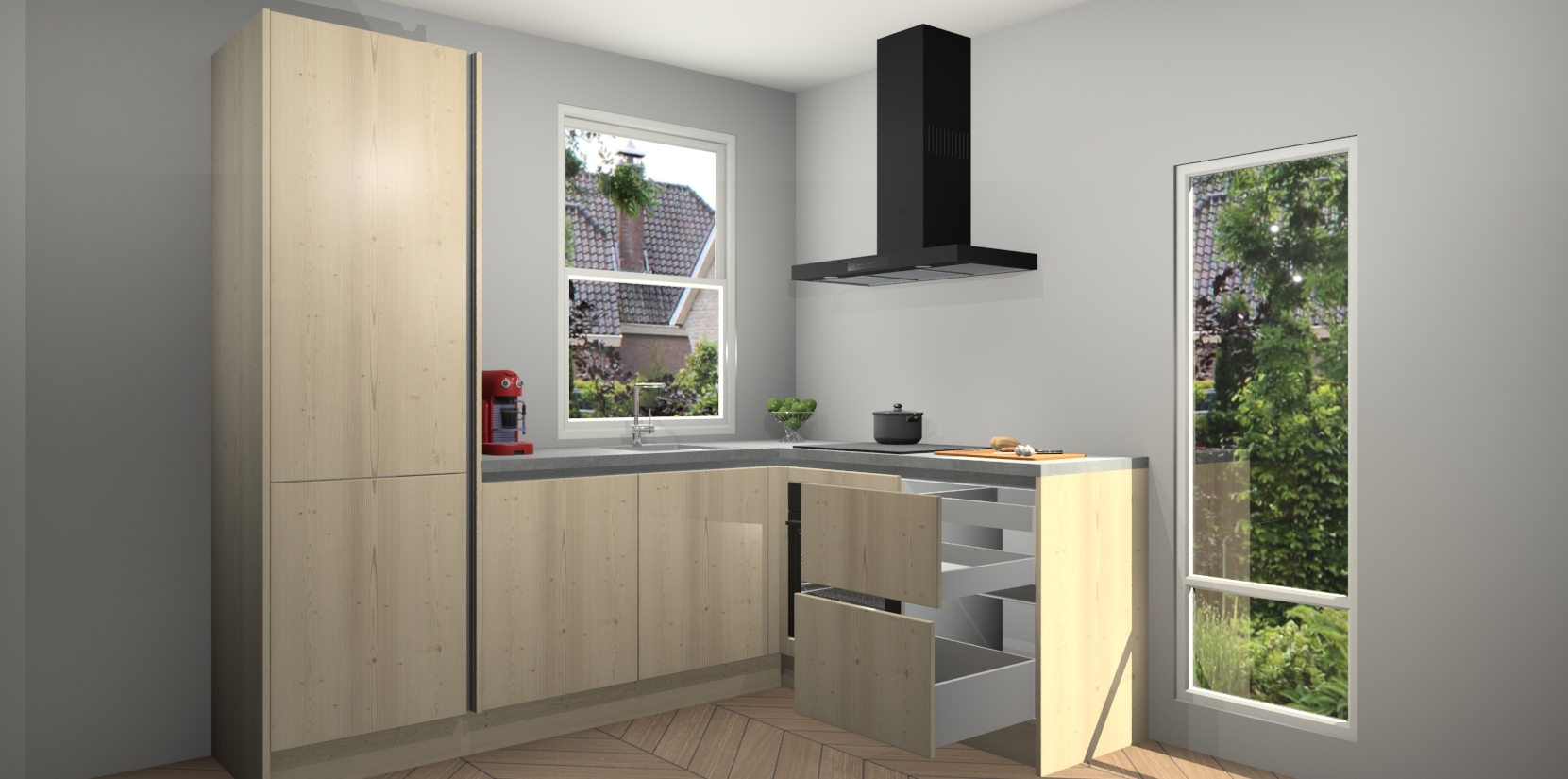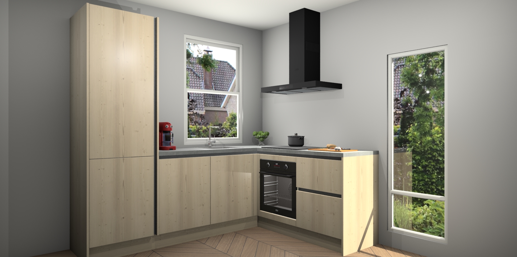 De prachtige Vuren greeploze keuken Phuket is de perfecte keuze als u op zoek bent naar een moderne hoekkeuken met alle luxe en comfort die u kunt verwachten! De uitstraling in het houtlook-design draagt bij aan de warme sfeer die u nu al voelt wanneer u er naar kijkt. Heeft u genoeg van ouderwetse keukens? Probeer dan direct deze moderne, mooie hoekkeukens en laat iedereen verbluft achter!