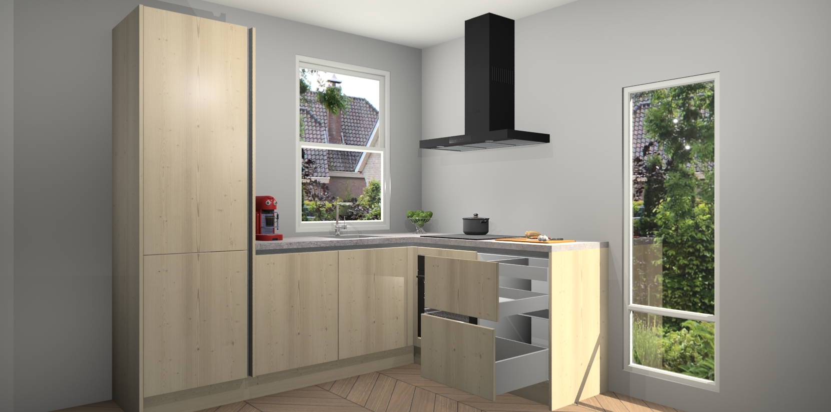 De prachtige Vuren greeploze keuken Phuket is de perfecte keuze als u op zoek bent naar een moderne hoekkeuken met alle luxe en comfort die u kunt verwachten! De uitstraling in het houtlook-design draagt bij aan de warme sfeer die u nu al voelt wanneer u er naar kijkt. Heeft u genoeg van ouderwetse keukens? Probeer dan direct deze moderne, mooie hoekkeukens en laat iedereen verbluft achter!
