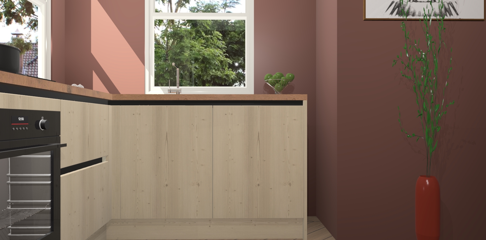 Wat maakt deze keuken zo bijzonder? Ten eerste geeft het houten werkblad uw ruimte een onmiskenbaar klassieke uitstraling. De natuurlijke afwerking roept warmte en elegantie op die nooit uit de mode zullen raken. Bovendien is het gemakkelijk schoon te houden en te onderhouden, zodat je er jarenlang plezier van kunt hebben. Als u op zoek bent naar extra gemak in uw keuken, dan heeft u bij het plaatsen van een bestelling bij ons ook de optie om uw toestellen te upgraden naar AEG-modellen - zo haalt u moderne innovatie van topmerken in apparatentechnologie rechtstreeks in huis.