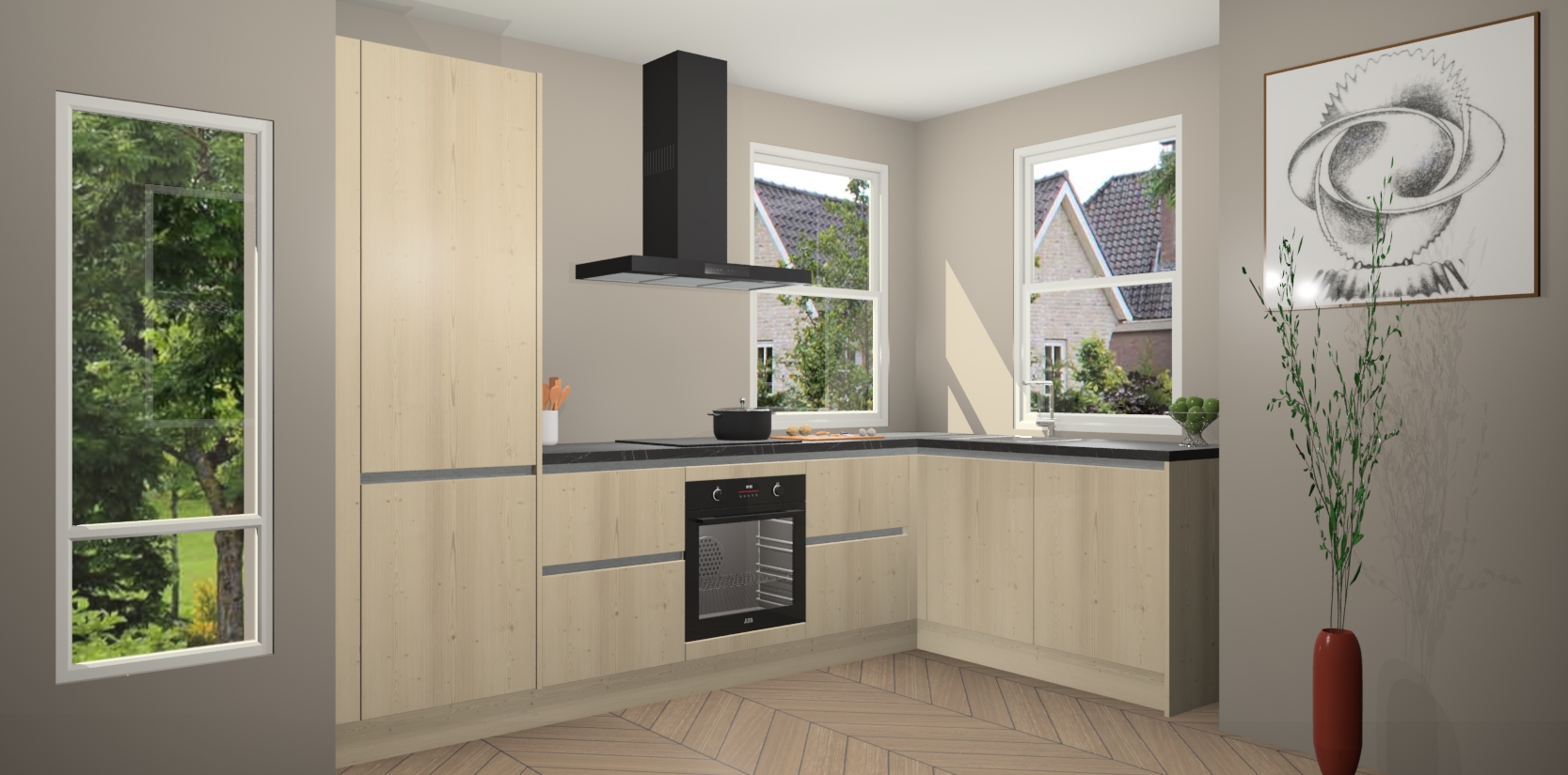 Wat maakt deze keuken zo bijzonder? Ten eerste geeft het houten werkblad uw ruimte een onmiskenbaar klassieke uitstraling. De natuurlijke afwerking roept warmte en elegantie op die nooit uit de mode zullen raken. Bovendien is het gemakkelijk schoon te houden en te onderhouden, zodat je er jarenlang plezier van kunt hebben. Als u op zoek bent naar extra gemak in uw keuken, dan heeft u bij het plaatsen van een bestelling bij ons ook de optie om uw toestellen te upgraden naar AEG-modellen - zo haalt u moderne innovatie van topmerken in apparatentechnologie rechtstreeks in huis.