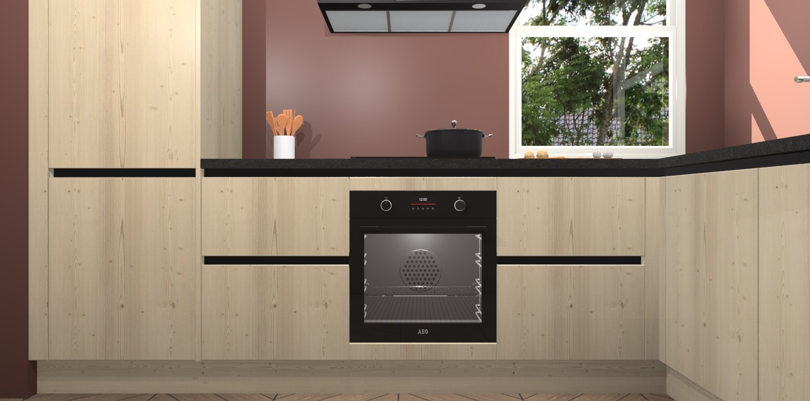 Wat maakt deze keuken zo bijzonder? Ten eerste geeft het houten werkblad uw ruimte een onmiskenbaar klassieke uitstraling. De natuurlijke afwerking roept warmte en elegantie op die nooit uit de mode zullen raken. Bovendien is het gemakkelijk schoon te houden en te onderhouden, zodat je er jarenlang plezier van kunt hebben. Als u op zoek bent naar extra gemak in uw keuken, dan heeft u bij het plaatsen van een bestelling bij ons ook de optie om uw toestellen te upgraden naar AEG-modellen - zo haalt u moderne innovatie van topmerken in apparatentechnologie rechtstreeks in huis.