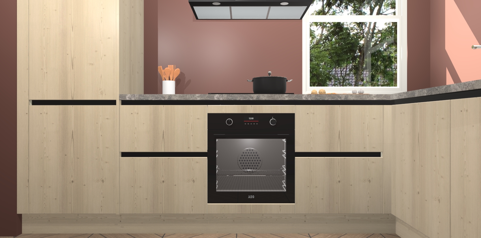 Wat maakt deze keuken zo bijzonder? Ten eerste geeft het houten werkblad uw ruimte een onmiskenbaar klassieke uitstraling. De natuurlijke afwerking roept warmte en elegantie op die nooit uit de mode zullen raken. Bovendien is het gemakkelijk schoon te houden en te onderhouden, zodat je er jarenlang plezier van kunt hebben. Als u op zoek bent naar extra gemak in uw keuken, dan heeft u bij het plaatsen van een bestelling bij ons ook de optie om uw toestellen te upgraden naar AEG-modellen - zo haalt u moderne innovatie van topmerken in apparatentechnologie rechtstreeks in huis.