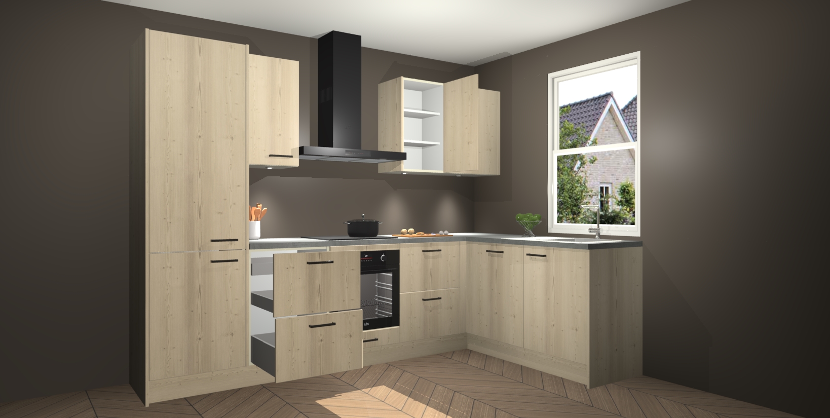 Maak kennis met de trendsettende en luxe Vuren keuken Bazel! Deze uitzonderlijke keuken van Duitse kwaliteit is stijlvol, modern en perfect om elk huis mee op te fleuren. De binnenkant van de kasten worden meegenomen in een bijpassende kleur om een samenhangende eigentijdse esthetiek te voltooien. U zult dol zijn op hoe uw pas gerenoveerde keuken eruitziet met de Vuren editie!