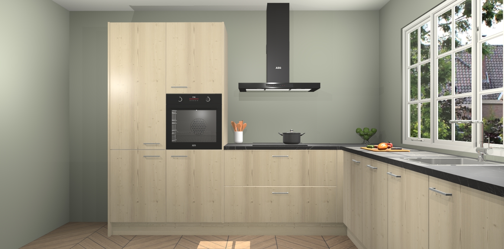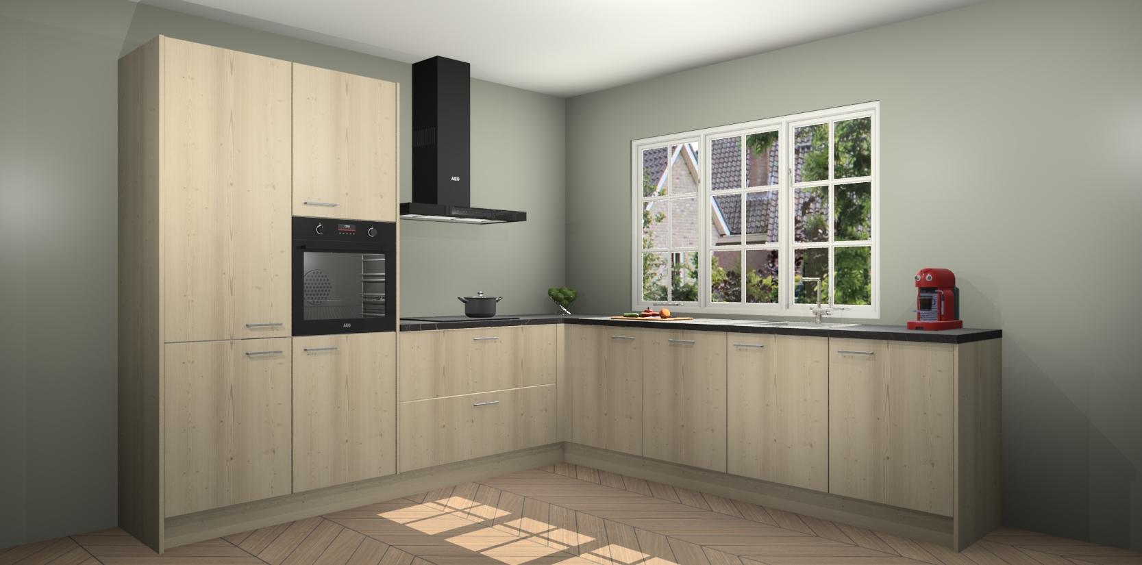 De keuken heeft veel opbergruimte, waardoor u alle ingrediënten gemakkelijk bereikbaar hebt staan. En daarnaast bevat deze volledig uitgeruste keuken ook 5 ingebouwde apparaten: een oven, inductiekookplaat, afzuigkap, vaatwasser en koelkast. Deze zijn heel eenvoudig na bestellen te upgraden naar AEG als u dit wilt. Bovendien zijn de softclose-kastdeuren ideaal; geef ze gewoon even een tikje en ze sluiten automatisch met geruisloze precisie.