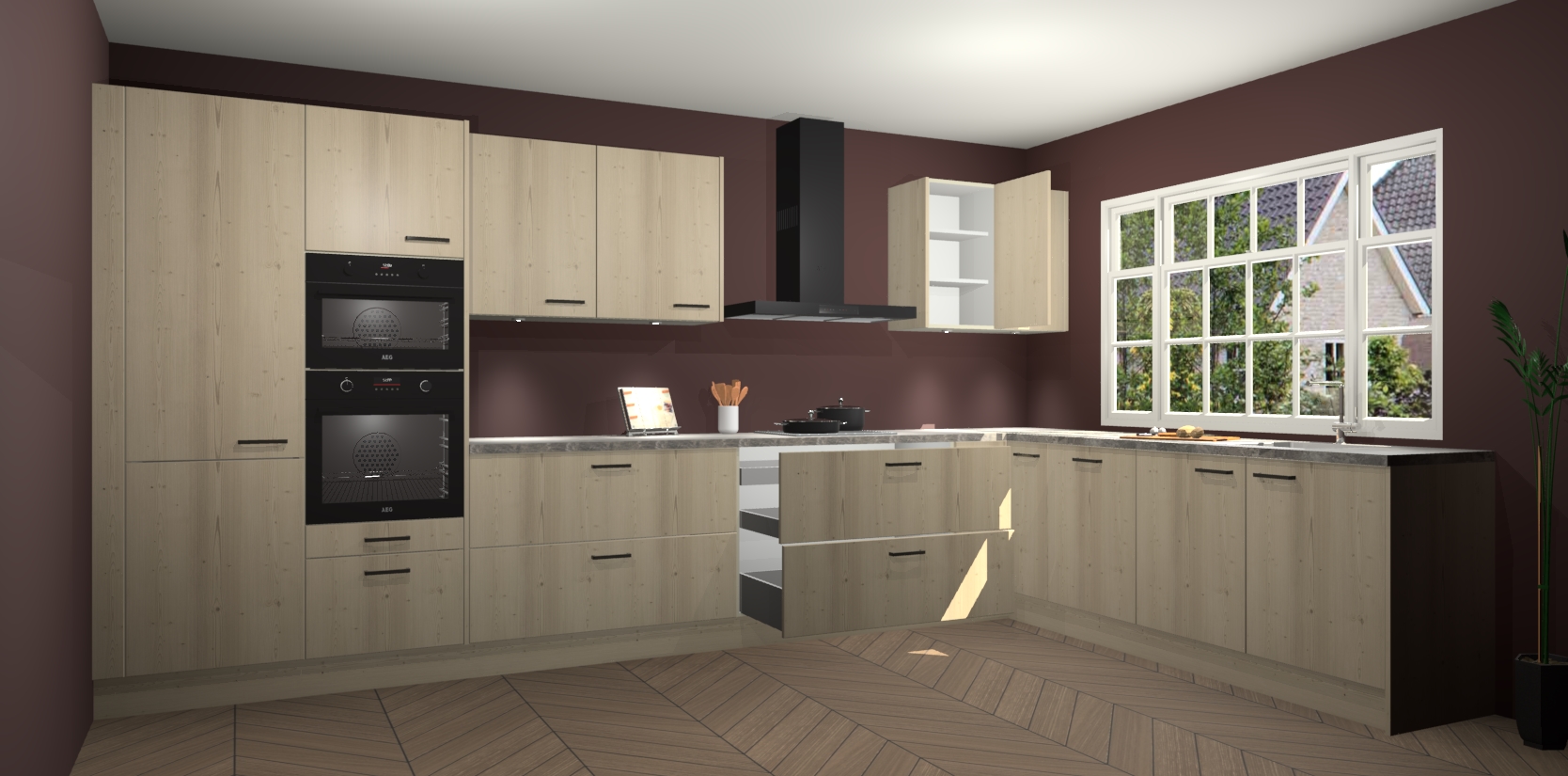 Kom dichtbij de perfecte keuken van uw dromen met de vuren keuken Graz. Met een prachtige houtlook en eigentijds ontwerp, straalt deze keuken warmte en sfeer uit. Of u nu liefhebber bent van traditionele of moderne stijlen, er is genoeg ruimte om aan al uw behoeften te voldoen.