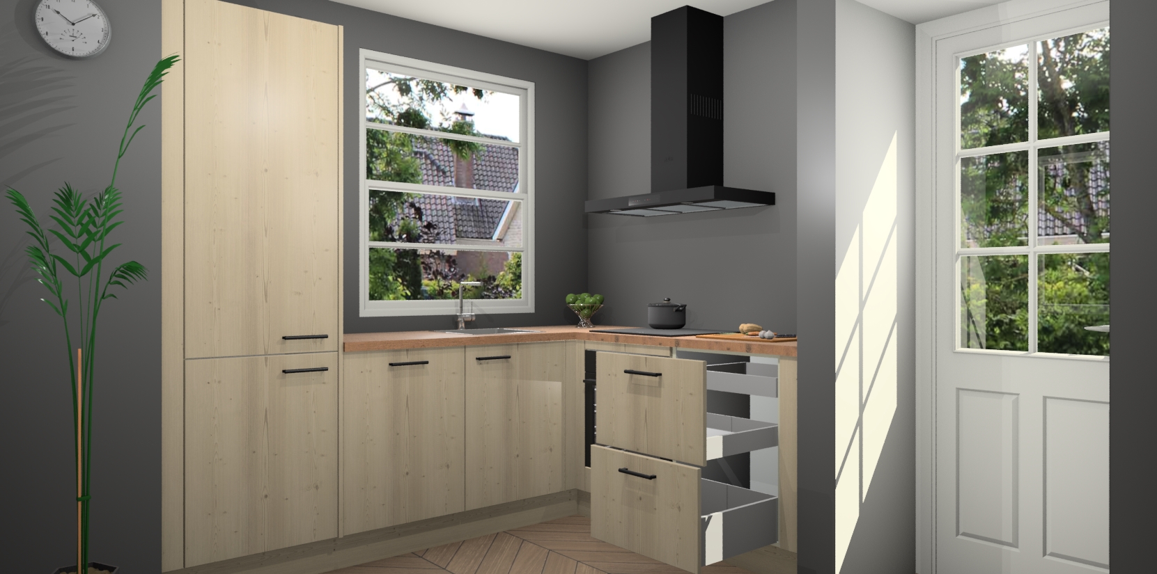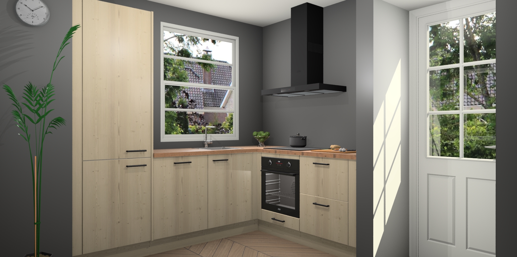 Wilt u een echte aanwinst voor uw keuken, maar bent u op zoek naar iets specialers dan de standaardkeukens? Kies dan voor de Vuren keuken Harbin! Dit prachtige hoekkeukenontwerp geeft u alle ruimte om optimaal te genieten van heerlijk koken. Het uitmuntende afwerkingsniveau, de fraaie houtstructuur en de sfeervolle zwarte grepen maken van de Vuren keuken Harbin de perfecte keuze voor zowel enthousiaste thuiskoks als design-minded interieurliefhebbers.