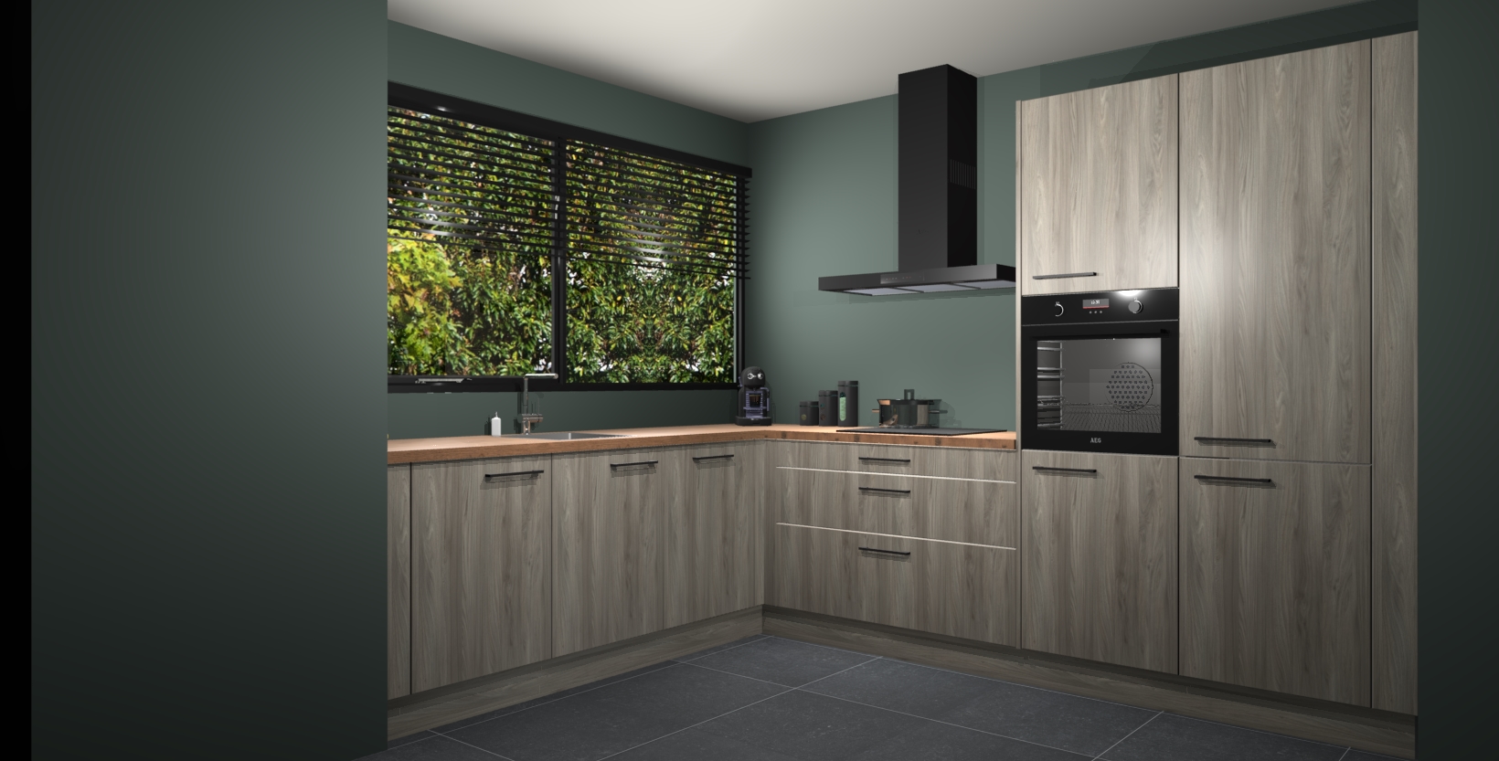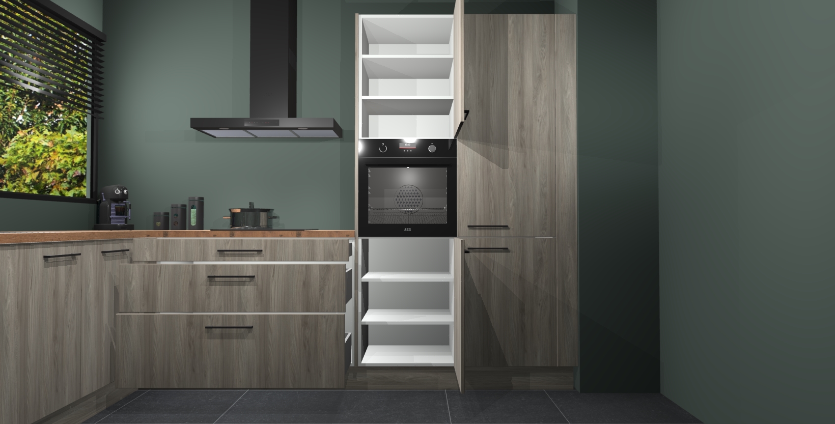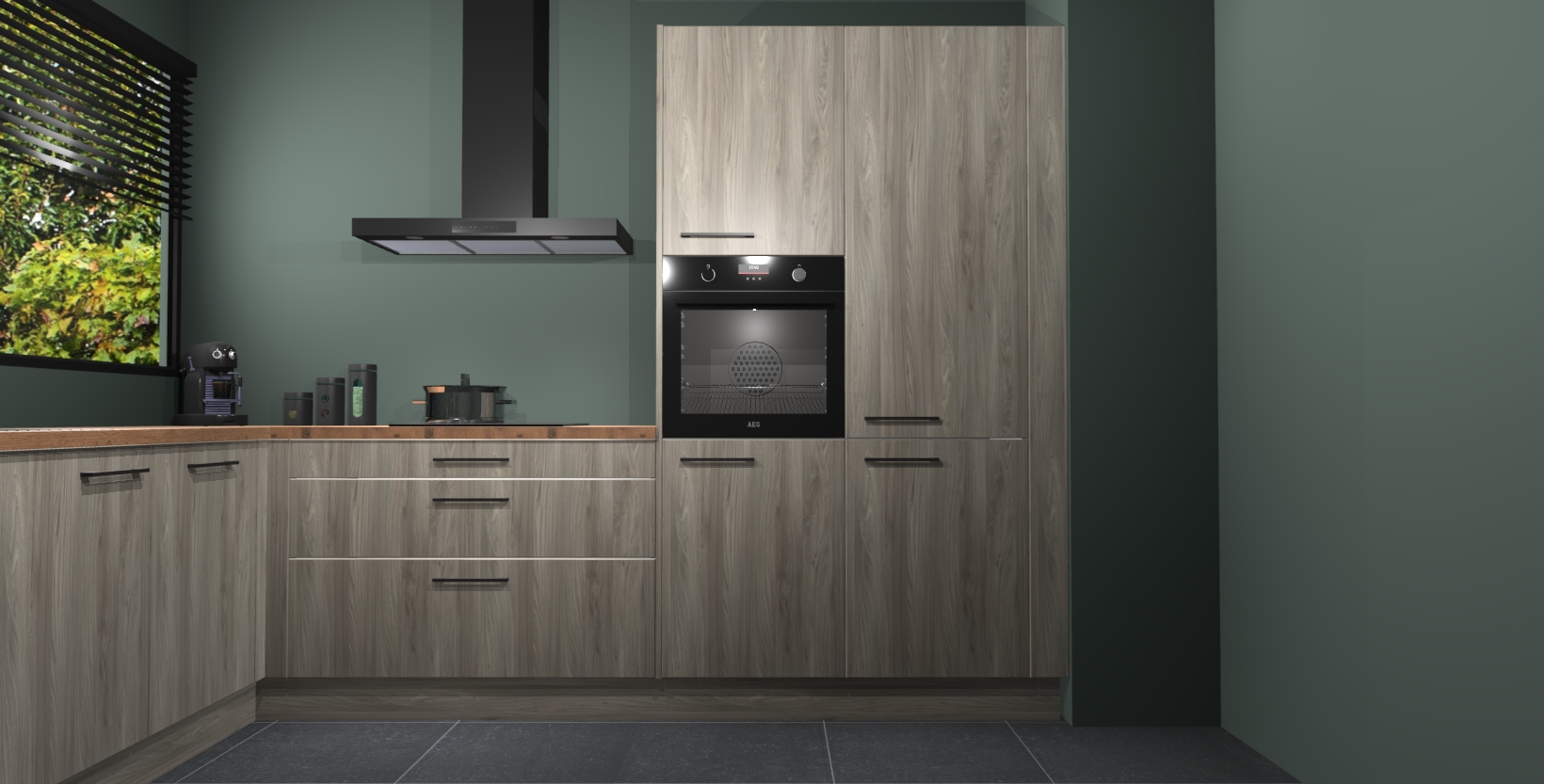 Met een modern, tijdloos design en ruime opslagruimte, zult u zich in no-time thuis voelen in uw nieuwe keuken. Uw leven wordt eenvoudiger met de soft-close deuren die voor het ultieme stille comfort zorgen - geen geluid dat u stoort terwijl u kookt. Ook is de keuken voorzien van 5 ingebouwde apparaten: een oven, inductie kookplaat, afzuigkap, vaatwasser en koelkast. Deze kunnen gemakkelijk na bestelling worden bijgewerkt naar AEG - waardoor uw luxe ervaring compleet is.
