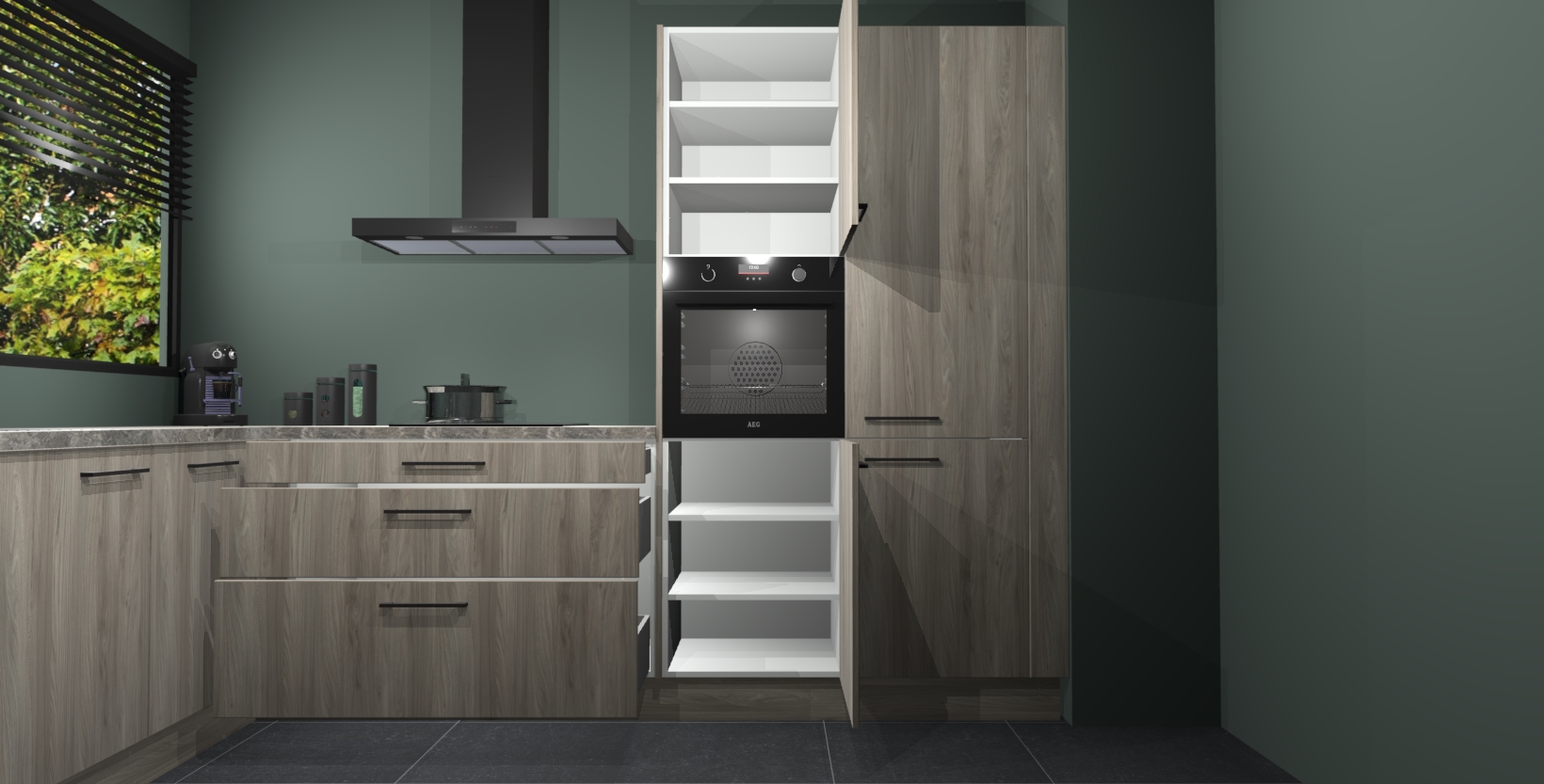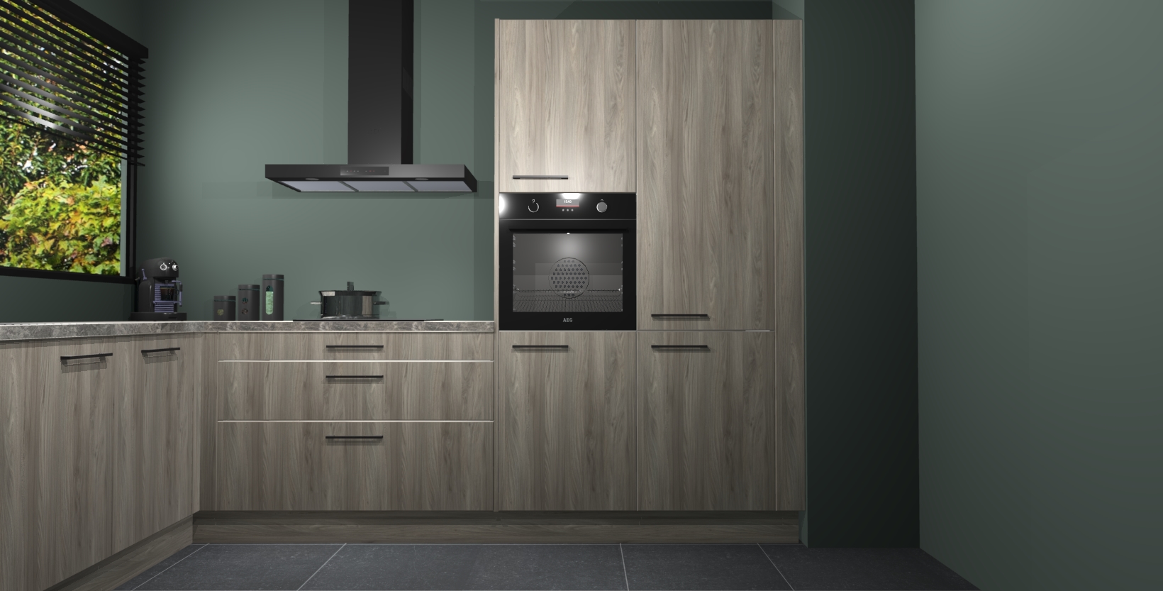 Met een modern, tijdloos design en ruime opslagruimte, zult u zich in no-time thuis voelen in uw nieuwe keuken. Uw leven wordt eenvoudiger met de soft-close deuren die voor het ultieme stille comfort zorgen - geen geluid dat u stoort terwijl u kookt. Ook is de keuken voorzien van 5 ingebouwde apparaten: een oven, inductie kookplaat, afzuigkap, vaatwasser en koelkast. Deze kunnen gemakkelijk na bestelling worden bijgewerkt naar AEG - waardoor uw luxe ervaring compleet is.