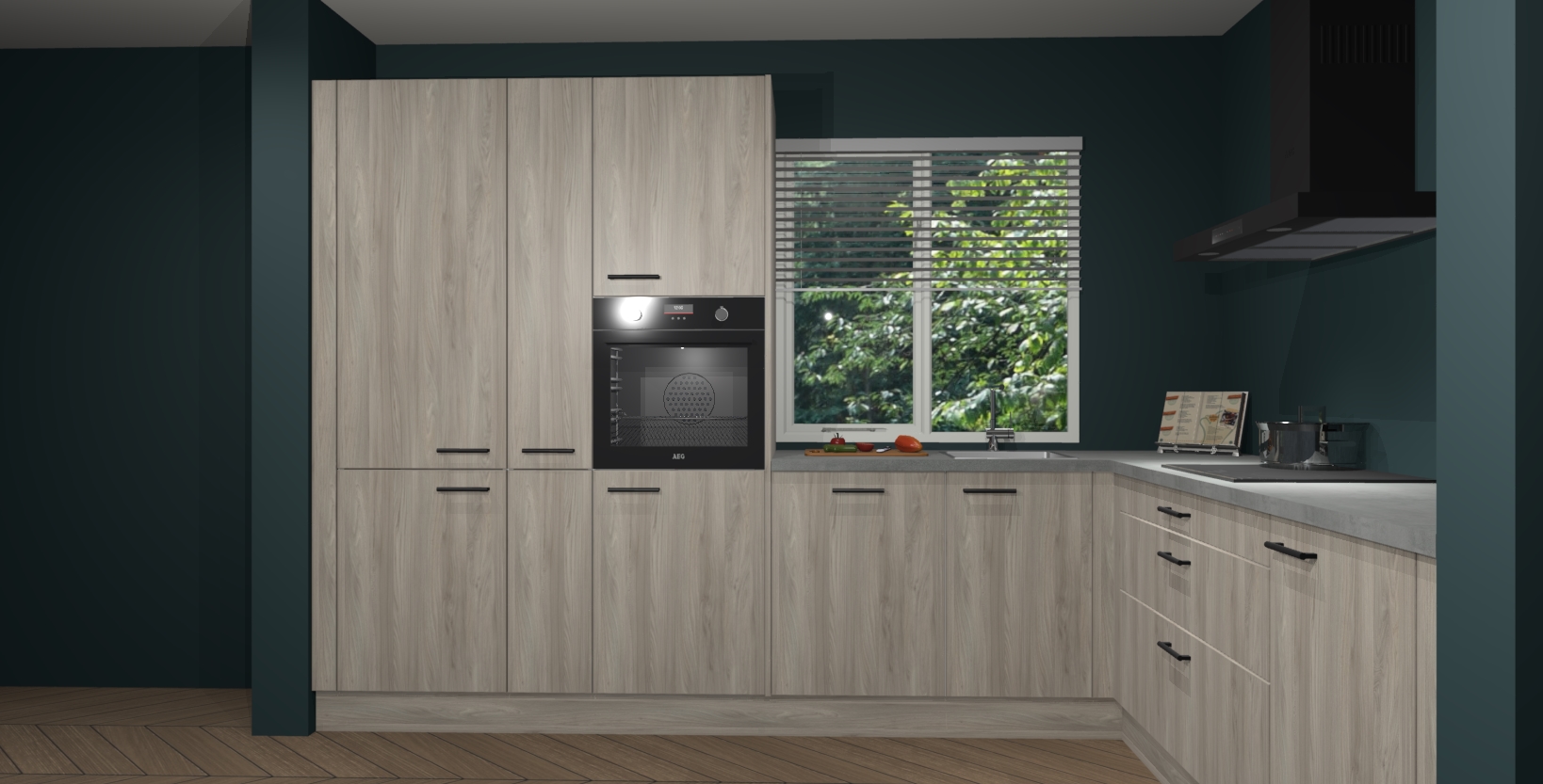 Met een modern, tijdloos design en ruime opslagruimte, zult u zich in no-time thuis voelen in uw nieuwe keuken. Uw leven wordt eenvoudiger met de soft-close deuren die voor het ultieme stille comfort zorgen - geen geluid dat u stoort terwijl u kookt. Ook is de keuken voorzien van 5 ingebouwde apparaten: een oven, inductie kookplaat, afzuigkap, vaatwasser en koelkast. Deze kunnen gemakkelijk na bestelling worden bijgewerkt naar AEG - waardoor uw luxe ervaring compleet is.
