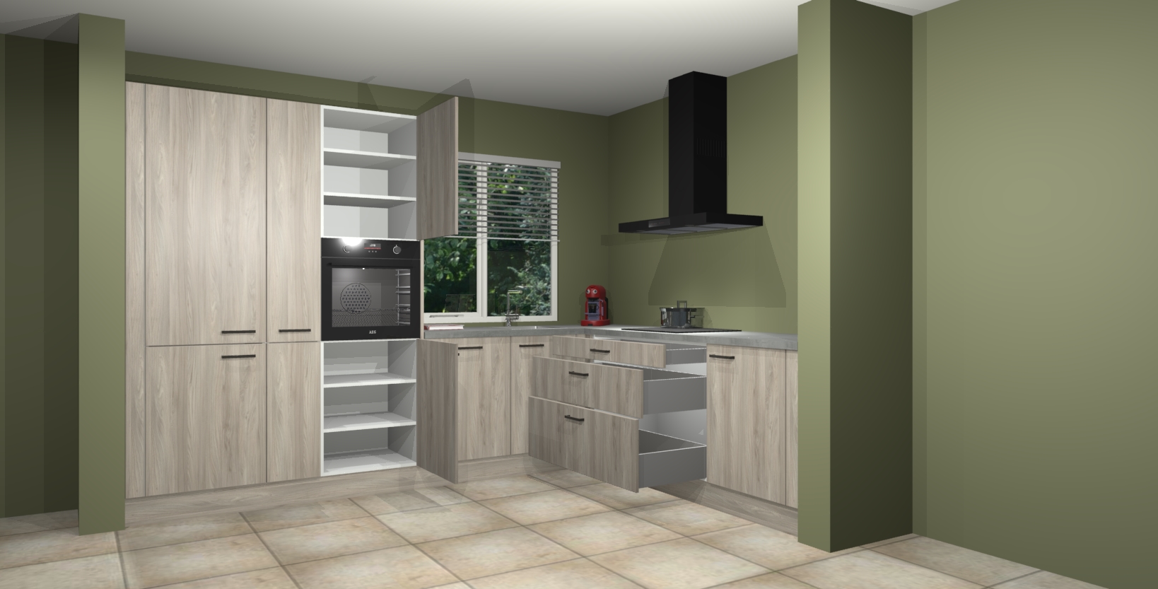 Met een modern, tijdloos design en ruime opslagruimte, zult u zich in no-time thuis voelen in uw nieuwe keuken. Uw leven wordt eenvoudiger met de soft-close deuren die voor het ultieme stille comfort zorgen - geen geluid dat u stoort terwijl u kookt. Ook is de keuken voorzien van 5 ingebouwde apparaten: een oven, inductie kookplaat, afzuigkap, vaatwasser en koelkast. Deze kunnen gemakkelijk na bestelling worden bijgewerkt naar AEG - waardoor uw luxe ervaring compleet is.