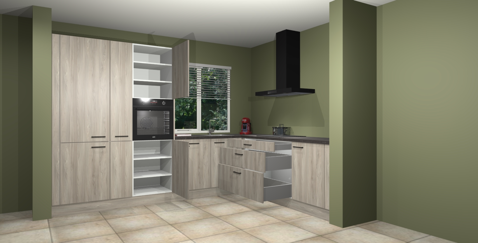 Met een modern, tijdloos design en ruime opslagruimte, zult u zich in no-time thuis voelen in uw nieuwe keuken. Uw leven wordt eenvoudiger met de soft-close deuren die voor het ultieme stille comfort zorgen - geen geluid dat u stoort terwijl u kookt. Ook is de keuken voorzien van 5 ingebouwde apparaten: een oven, inductie kookplaat, afzuigkap, vaatwasser en koelkast. Deze kunnen gemakkelijk na bestelling worden bijgewerkt naar AEG - waardoor uw luxe ervaring compleet is.