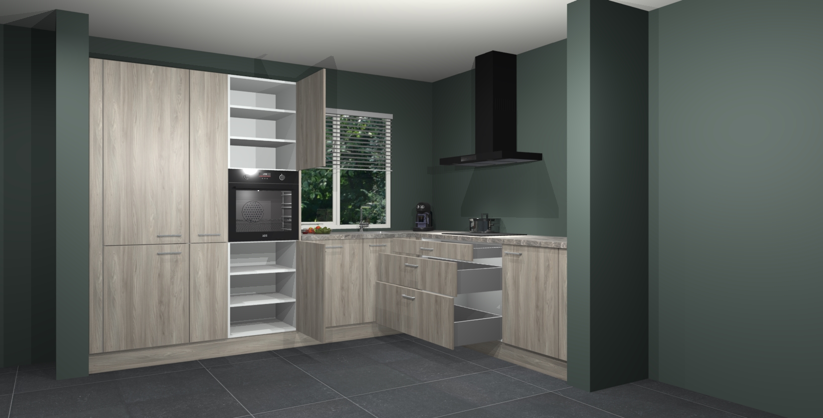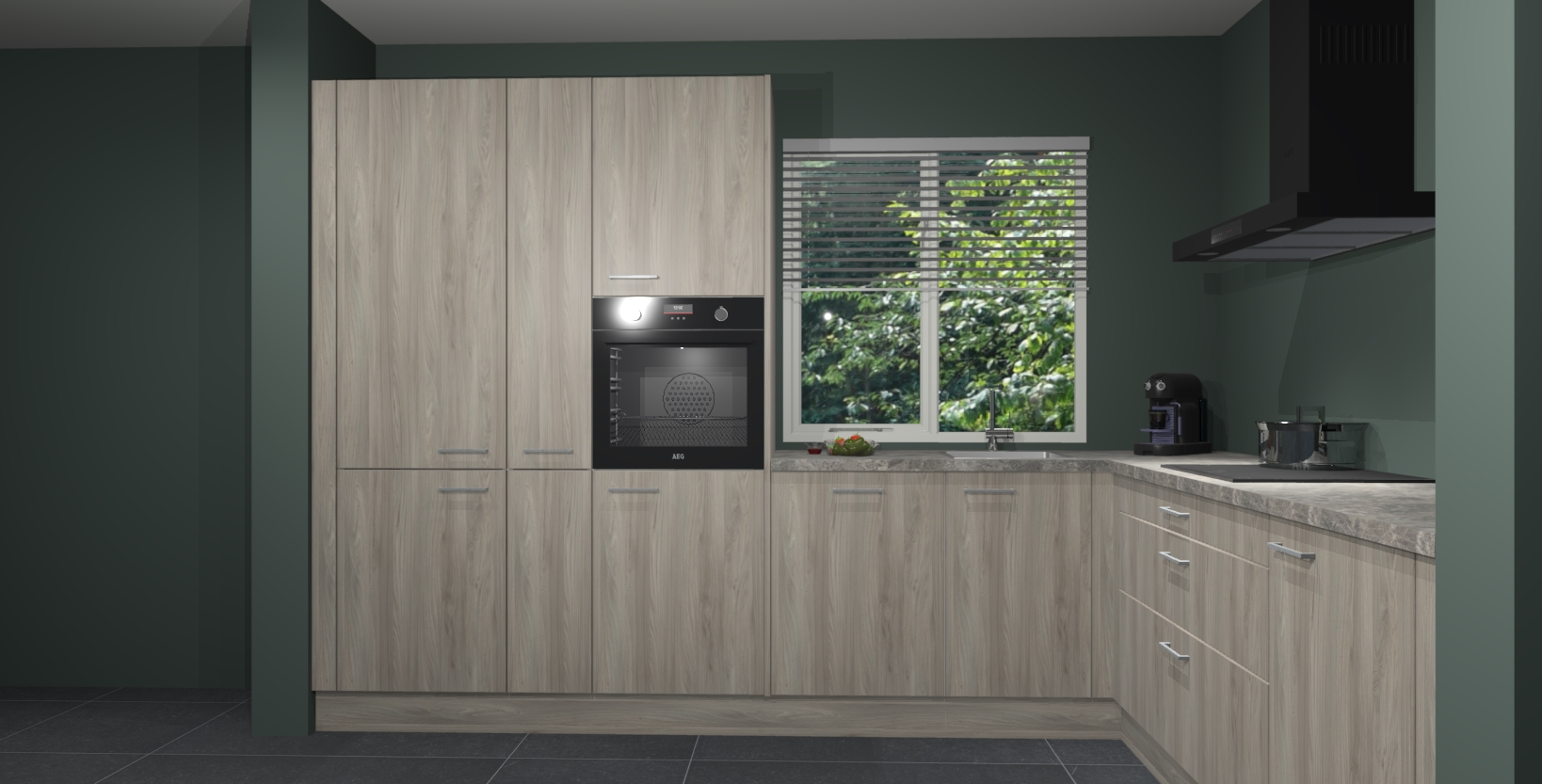 Met een modern, tijdloos design en ruime opslagruimte, zult u zich in no-time thuis voelen in uw nieuwe keuken. Uw leven wordt eenvoudiger met de soft-close deuren die voor het ultieme stille comfort zorgen - geen geluid dat u stoort terwijl u kookt. Ook is de keuken voorzien van 5 ingebouwde apparaten: een oven, inductie kookplaat, afzuigkap, vaatwasser en koelkast. Deze kunnen gemakkelijk na bestelling worden bijgewerkt naar AEG - waardoor uw luxe ervaring compleet is.