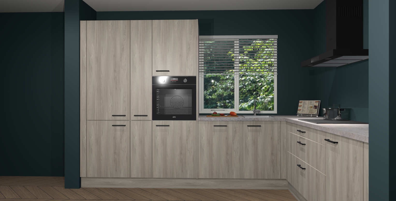 Met een modern, tijdloos design en ruime opslagruimte, zult u zich in no-time thuis voelen in uw nieuwe keuken. Uw leven wordt eenvoudiger met de soft-close deuren die voor het ultieme stille comfort zorgen - geen geluid dat u stoort terwijl u kookt. Ook is de keuken voorzien van 5 ingebouwde apparaten: een oven, inductie kookplaat, afzuigkap, vaatwasser en koelkast. Deze kunnen gemakkelijk na bestelling worden bijgewerkt naar AEG - waardoor uw luxe ervaring compleet is.