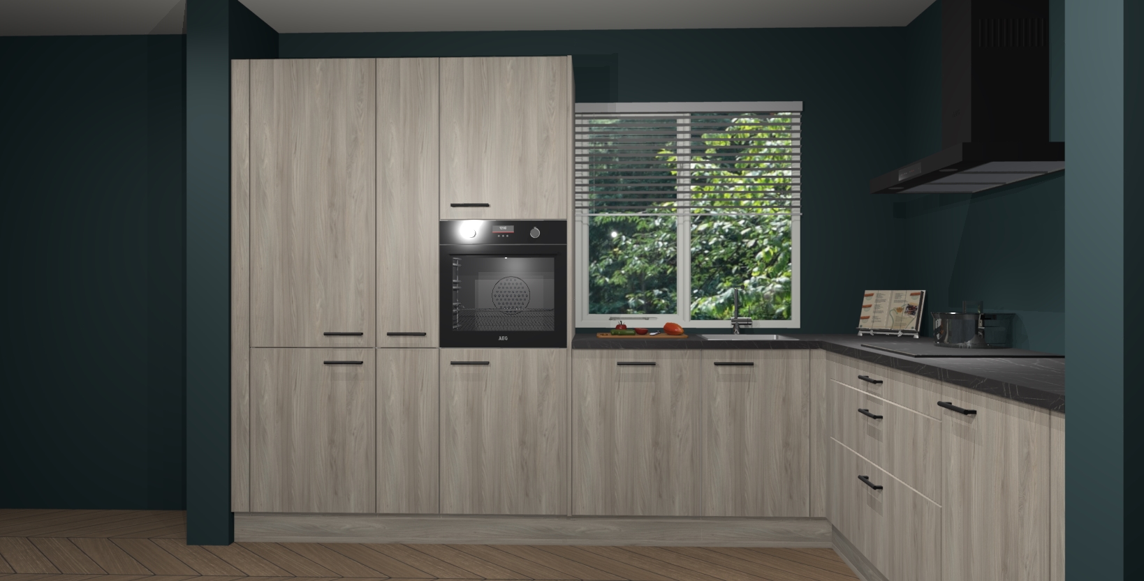 Met een modern, tijdloos design en ruime opslagruimte, zult u zich in no-time thuis voelen in uw nieuwe keuken. Uw leven wordt eenvoudiger met de soft-close deuren die voor het ultieme stille comfort zorgen - geen geluid dat u stoort terwijl u kookt. Ook is de keuken voorzien van 5 ingebouwde apparaten: een oven, inductie kookplaat, afzuigkap, vaatwasser en koelkast. Deze kunnen gemakkelijk na bestelling worden bijgewerkt naar AEG - waardoor uw luxe ervaring compleet is.