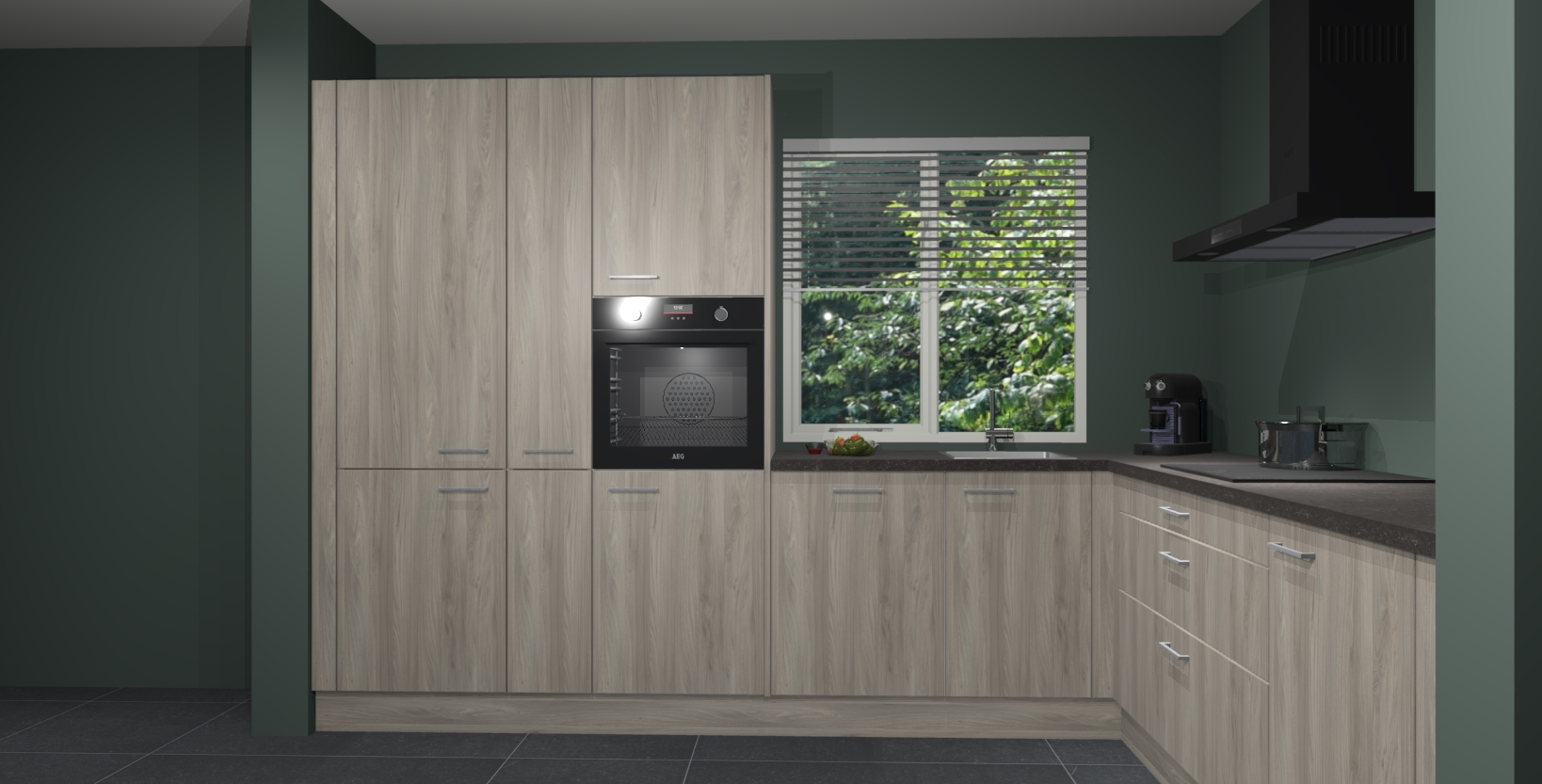 Met een modern, tijdloos design en ruime opslagruimte, zult u zich in no-time thuis voelen in uw nieuwe keuken. Uw leven wordt eenvoudiger met de soft-close deuren die voor het ultieme stille comfort zorgen - geen geluid dat u stoort terwijl u kookt. Ook is de keuken voorzien van 5 ingebouwde apparaten: een oven, inductie kookplaat, afzuigkap, vaatwasser en koelkast. Deze kunnen gemakkelijk na bestelling worden bijgewerkt naar AEG - waardoor uw luxe ervaring compleet is.