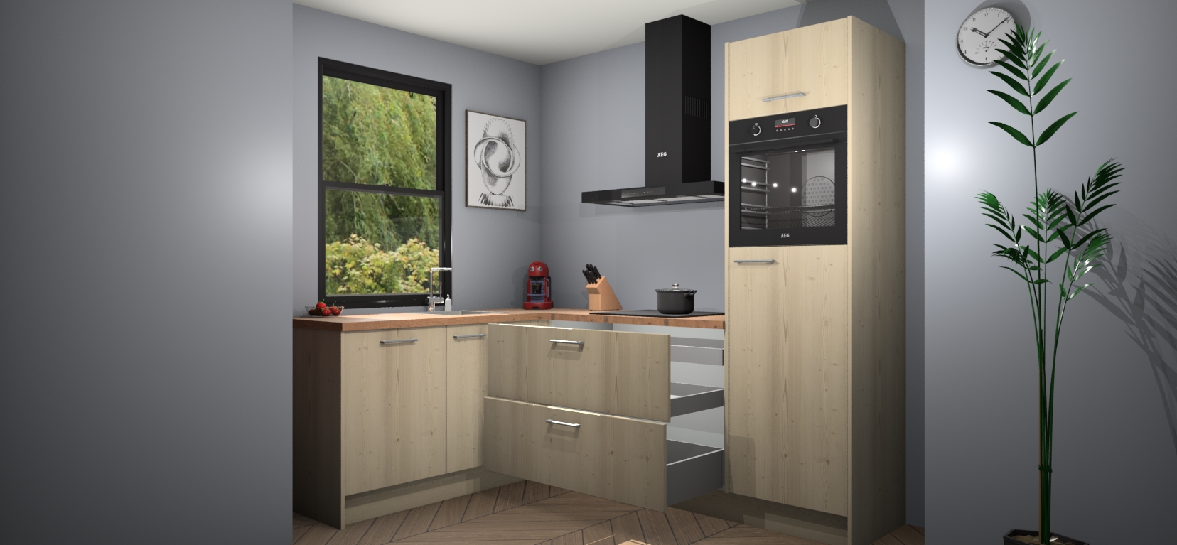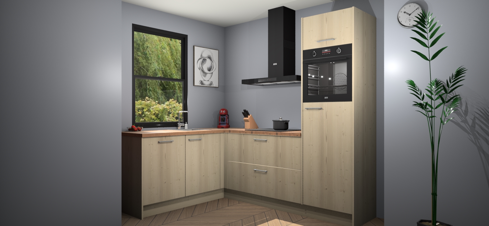 Deze prachtige hoekkeuken heeft alle benodigdheden om uw droomkook- en eetruimte compleet te maken. De Vuren kasten bieden een echo van raffinement, terwijl de 5 inbouwapparaten genoeg opties bieden voor het bereiden van heerlijke maaltijden. De oven, inductiekookplaat, afzuigkap, vaatwasser en koelkast zorgen ervoor dat u tijd in de keuken zo efficiënt mogelijk verloopt, terwijl ze ook dat extra vleugje luxe bieden.