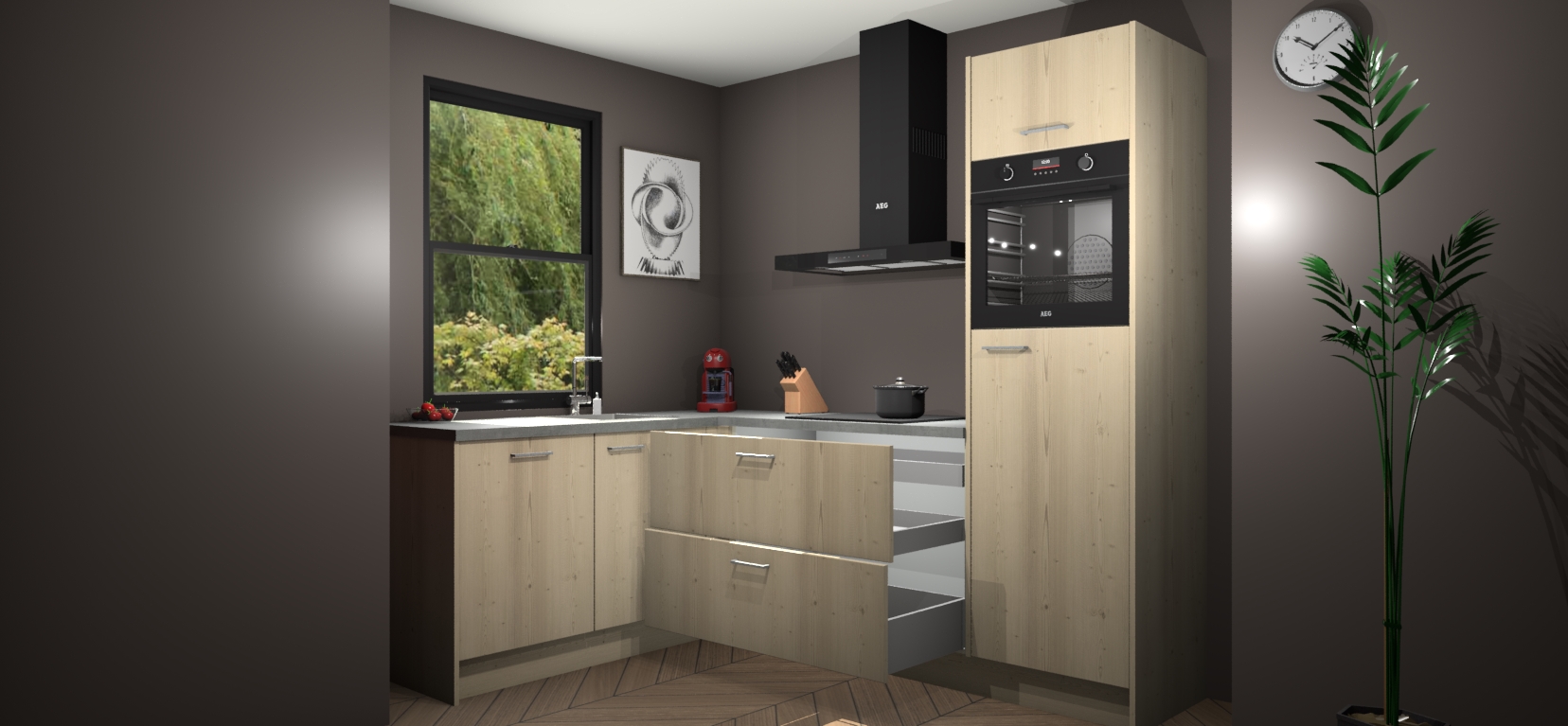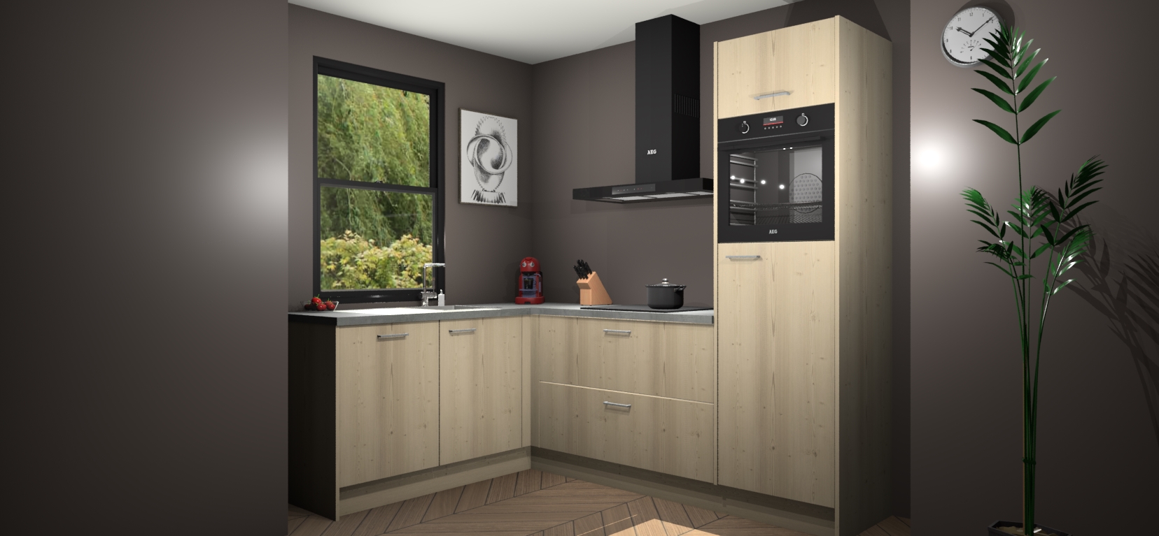 Deze prachtige hoekkeuken heeft alle benodigdheden om uw droomkook- en eetruimte compleet te maken. De Vuren kasten bieden een echo van raffinement, terwijl de 5 inbouwapparaten genoeg opties bieden voor het bereiden van heerlijke maaltijden. De oven, inductiekookplaat, afzuigkap, vaatwasser en koelkast zorgen ervoor dat u tijd in de keuken zo efficiënt mogelijk verloopt, terwijl ze ook dat extra vleugje luxe bieden.