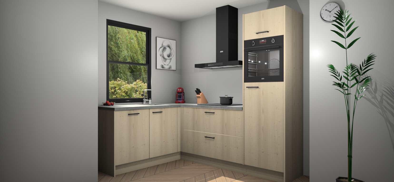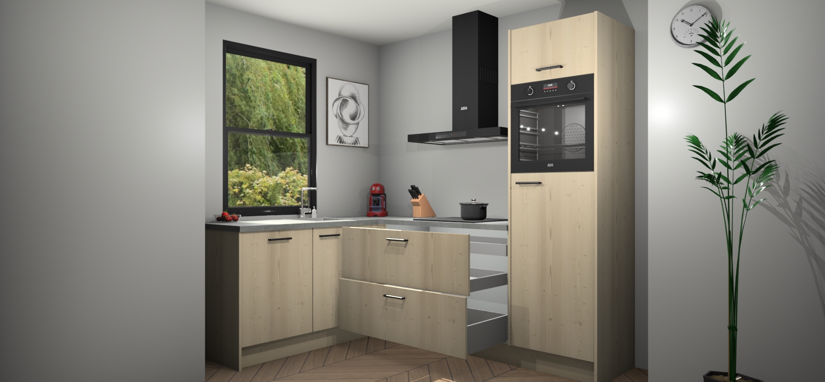 Deze prachtige hoekkeuken heeft alle benodigdheden om uw droomkook- en eetruimte compleet te maken. De Vuren kasten bieden een echo van raffinement, terwijl de 5 inbouwapparaten genoeg opties bieden voor het bereiden van heerlijke maaltijden. De oven, inductiekookplaat, afzuigkap, vaatwasser en koelkast zorgen ervoor dat u tijd in de keuken zo efficiënt mogelijk verloopt, terwijl ze ook dat extra vleugje luxe bieden.