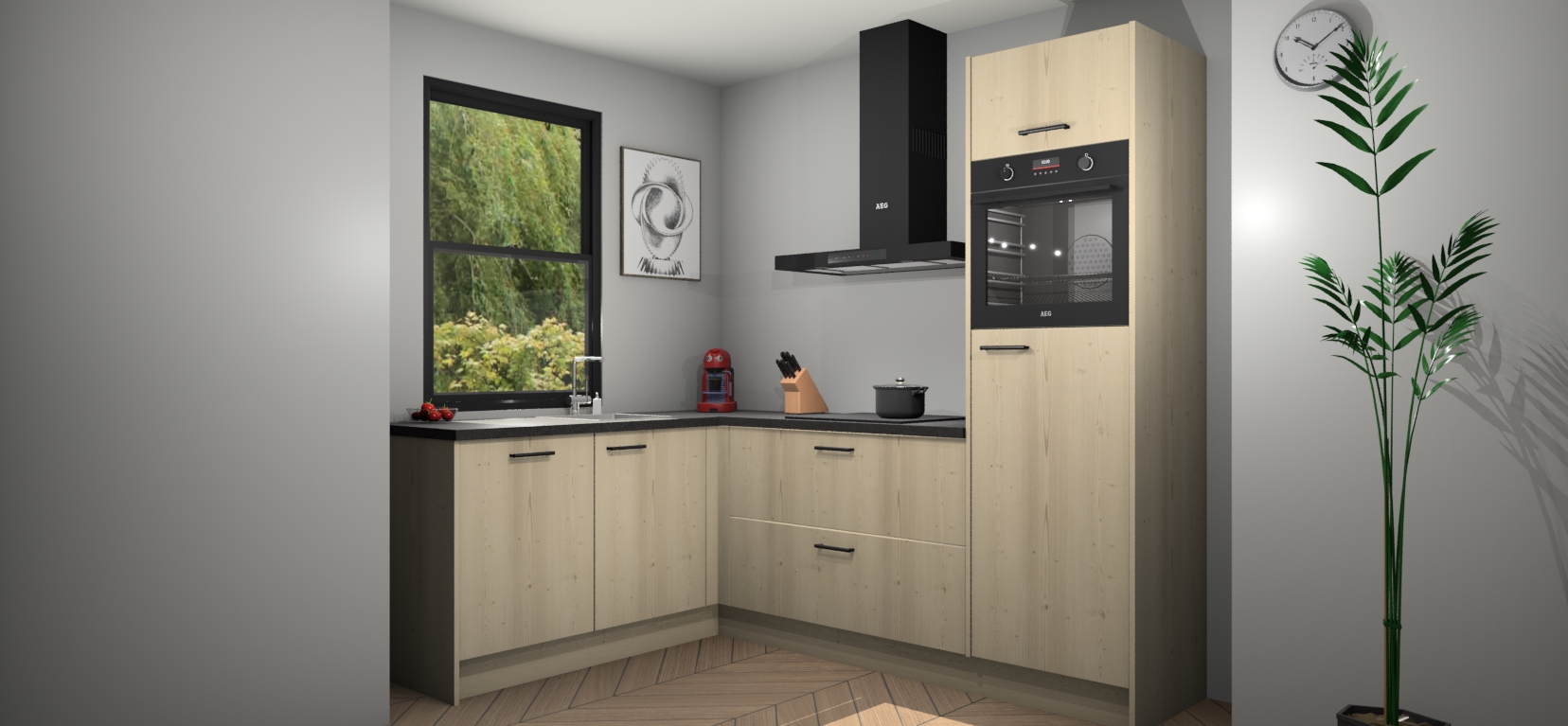 Deze prachtige hoekkeuken heeft alle benodigdheden om uw droomkook- en eetruimte compleet te maken. De Vuren kasten bieden een echo van raffinement, terwijl de 5 inbouwapparaten genoeg opties bieden voor het bereiden van heerlijke maaltijden. De oven, inductiekookplaat, afzuigkap, vaatwasser en koelkast zorgen ervoor dat u tijd in de keuken zo efficiënt mogelijk verloopt, terwijl ze ook dat extra vleugje luxe bieden.