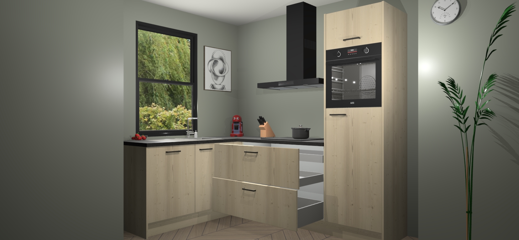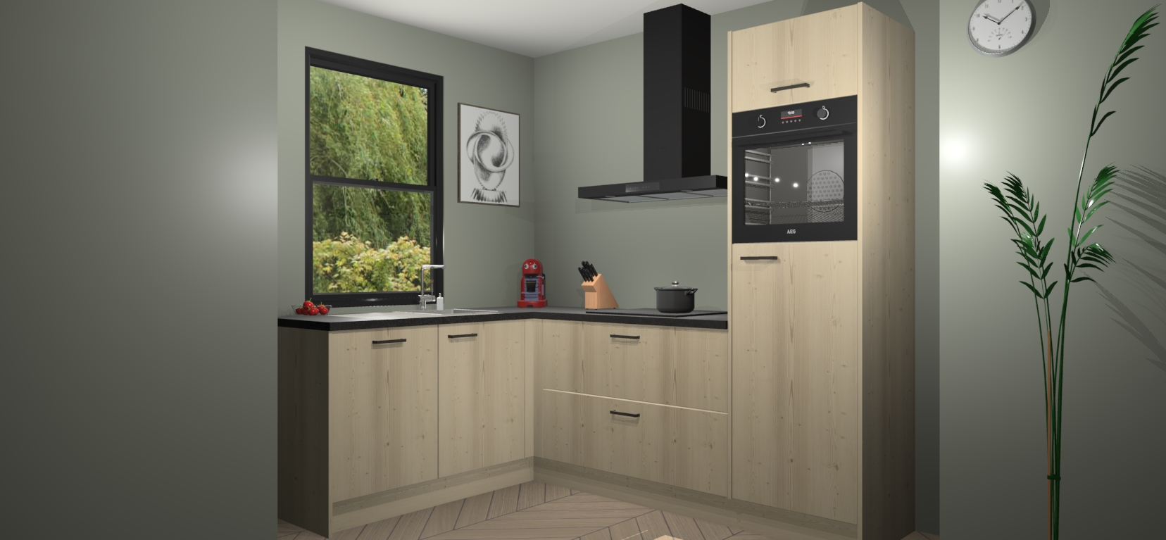 Deze prachtige hoekkeuken heeft alle benodigdheden om uw droomkook- en eetruimte compleet te maken. De Vuren kasten bieden een echo van raffinement, terwijl de 5 inbouwapparaten genoeg opties bieden voor het bereiden van heerlijke maaltijden. De oven, inductiekookplaat, afzuigkap, vaatwasser en koelkast zorgen ervoor dat u tijd in de keuken zo efficiënt mogelijk verloopt, terwijl ze ook dat extra vleugje luxe bieden.