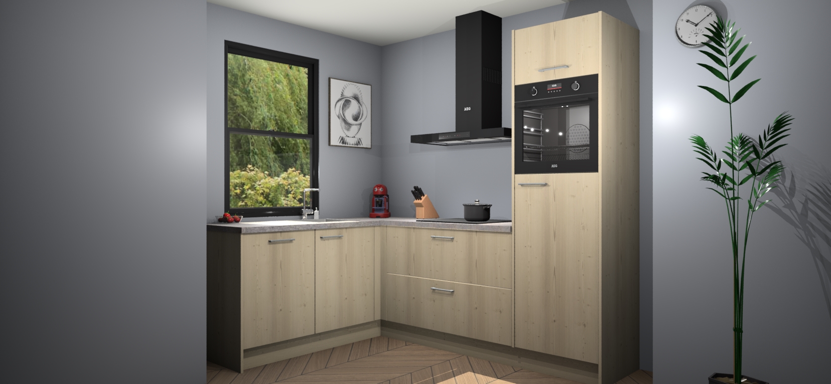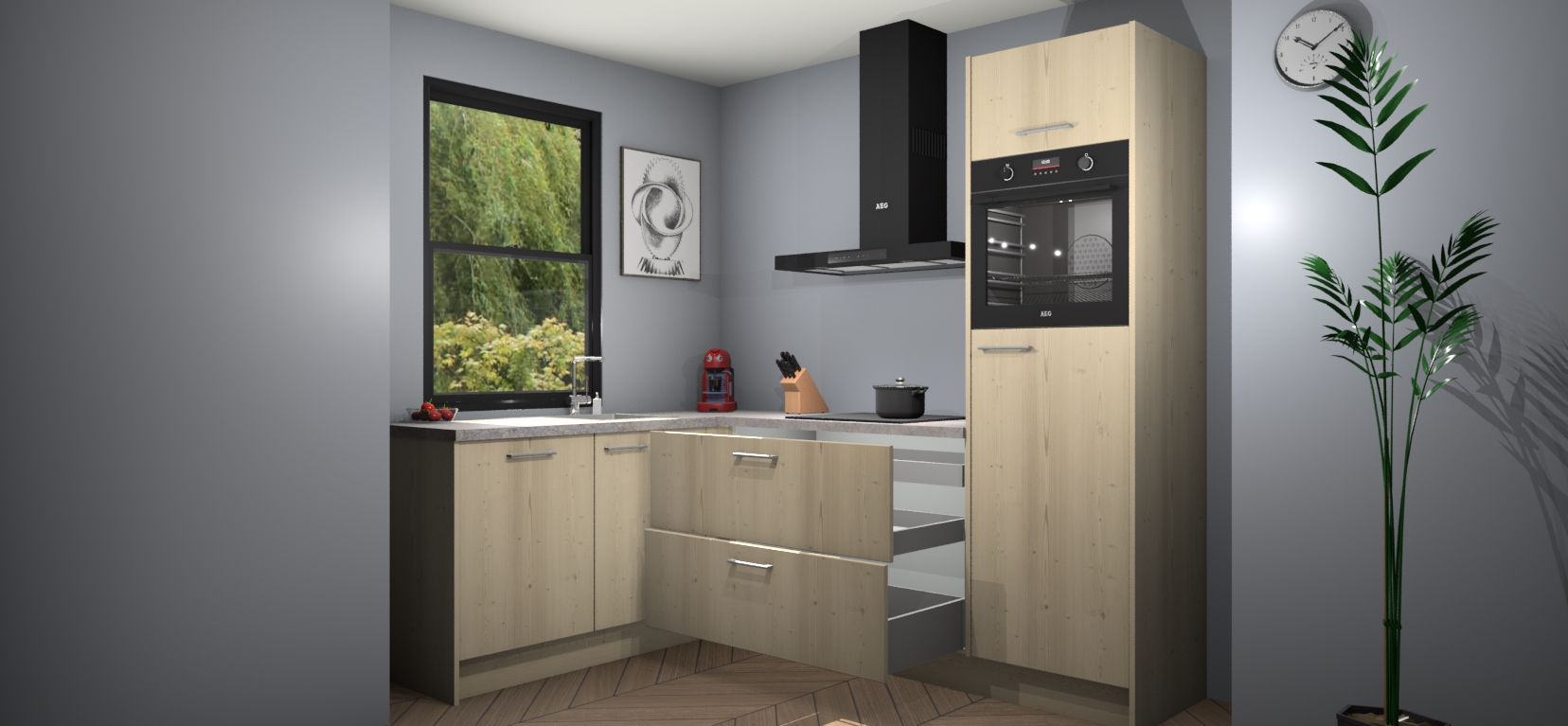 Deze prachtige hoekkeuken heeft alle benodigdheden om uw droomkook- en eetruimte compleet te maken. De Vuren kasten bieden een echo van raffinement, terwijl de 5 inbouwapparaten genoeg opties bieden voor het bereiden van heerlijke maaltijden. De oven, inductiekookplaat, afzuigkap, vaatwasser en koelkast zorgen ervoor dat u tijd in de keuken zo efficiënt mogelijk verloopt, terwijl ze ook dat extra vleugje luxe bieden.
