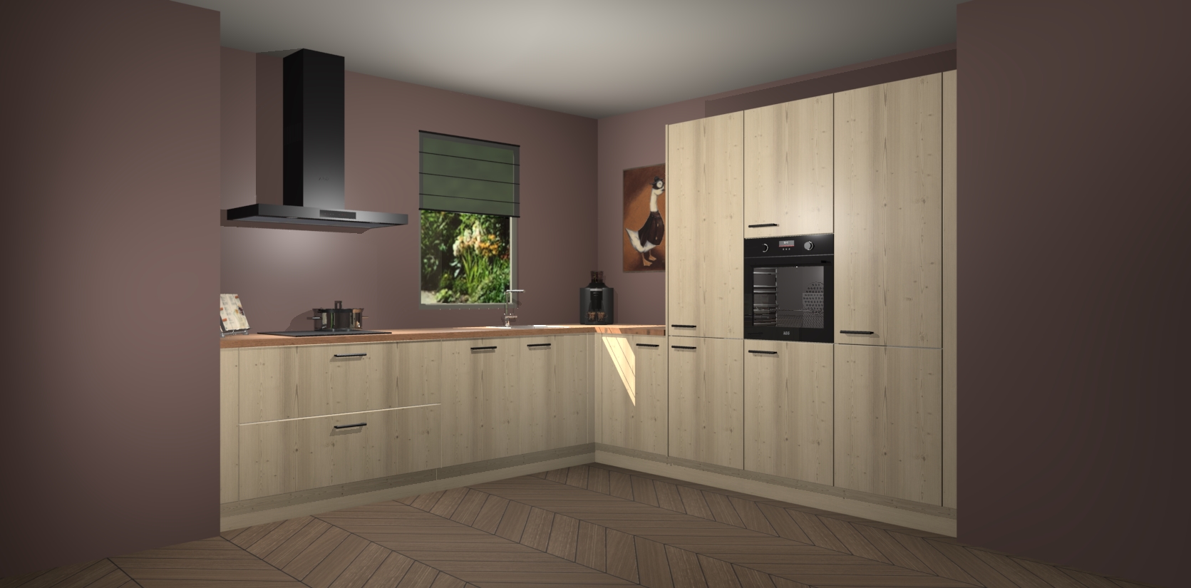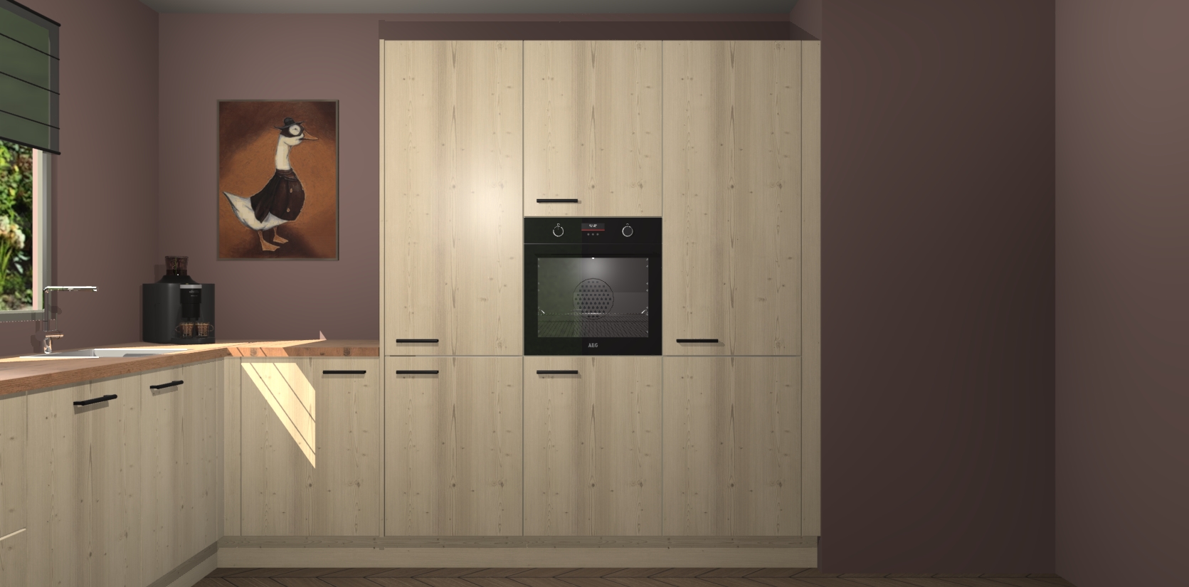 Welkom bij de Vuren keuken Laos. Deze prachtige keuken zal de komende jaren het middelpunt van de belangstelling in uw huis zijn. Uitgerust met vijf inbouwapparaten komt u nooit kookgereedschap tekort. Bovendien geeft de warme houtlook elke ruimte een uitnodigende en tijdloze uitstraling.