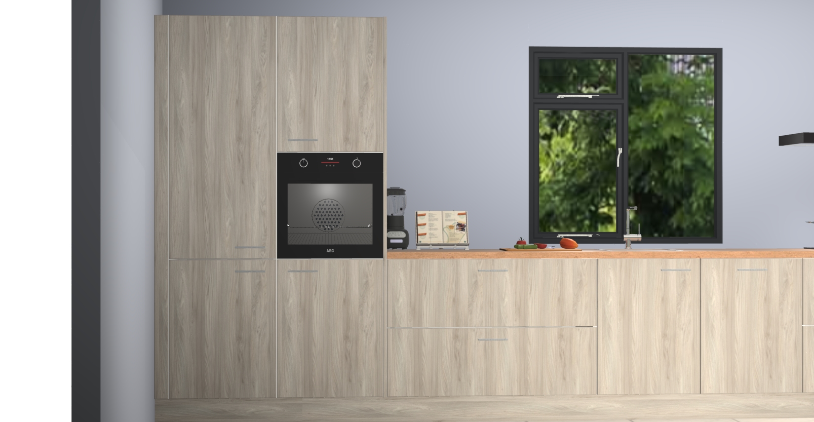 De Vuren keuken Lille wordt geleverd met vijf inbouwapparaten - een oven, inductiekookplaat, afzuigkap, vaatwasser en koelkast. Maar dat is nog niet alles! Na bestelling kunnen deze apparaten eenvoudig worden geüpgraded naar premium AEG-apparatuur. Bovendien is er zelfs de optie om de oven te vervangen door een combimagnetron of uw inductiekookplaat te vervangen door een kookplaat met geïntegreerde afzuiging.