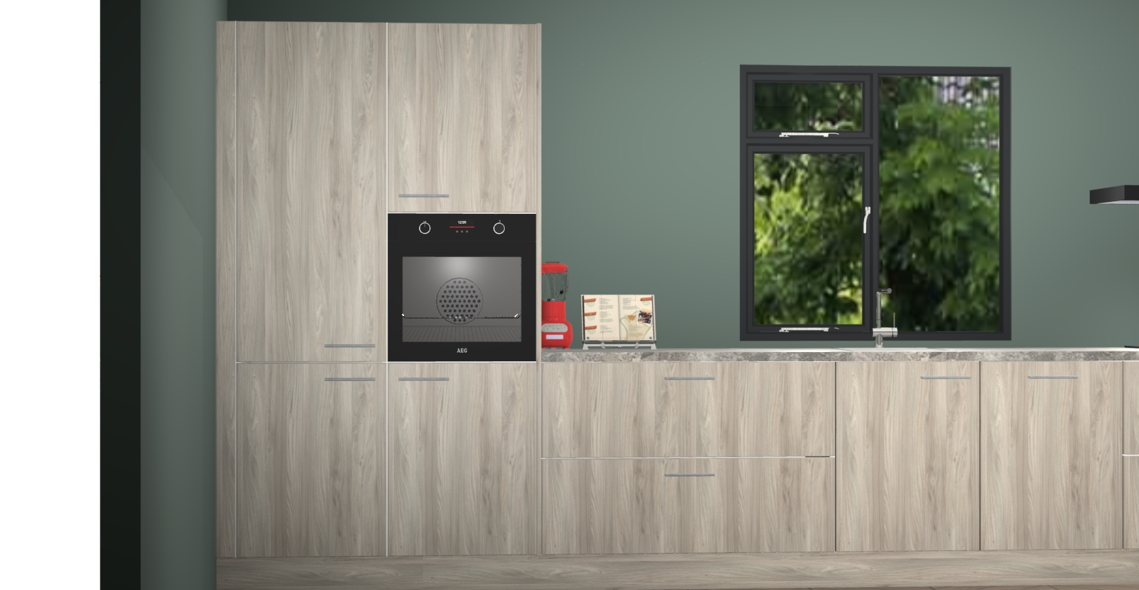 De Vuren keuken Lille wordt geleverd met vijf inbouwapparaten - een oven, inductiekookplaat, afzuigkap, vaatwasser en koelkast. Maar dat is nog niet alles! Na bestelling kunnen deze apparaten eenvoudig worden geüpgraded naar premium AEG-apparatuur. Bovendien is er zelfs de optie om de oven te vervangen door een combimagnetron of uw inductiekookplaat te vervangen door een kookplaat met geïntegreerde afzuiging.