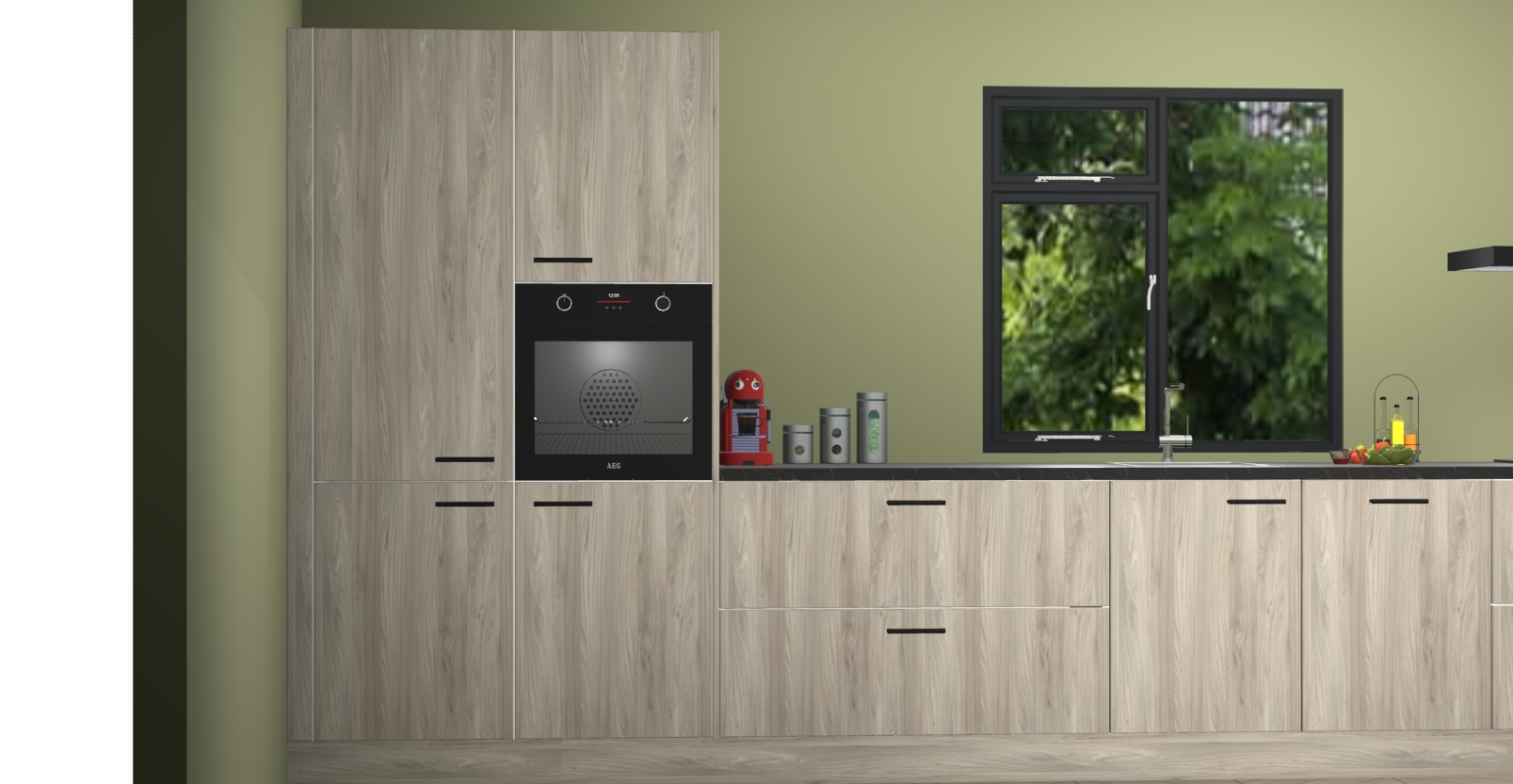 De Vuren keuken Lille wordt geleverd met vijf inbouwapparaten - een oven, inductiekookplaat, afzuigkap, vaatwasser en koelkast. Maar dat is nog niet alles! Na bestelling kunnen deze apparaten eenvoudig worden geüpgraded naar premium AEG-apparatuur. Bovendien is er zelfs de optie om de oven te vervangen door een combimagnetron of uw inductiekookplaat te vervangen door een kookplaat met geïntegreerde afzuiging.