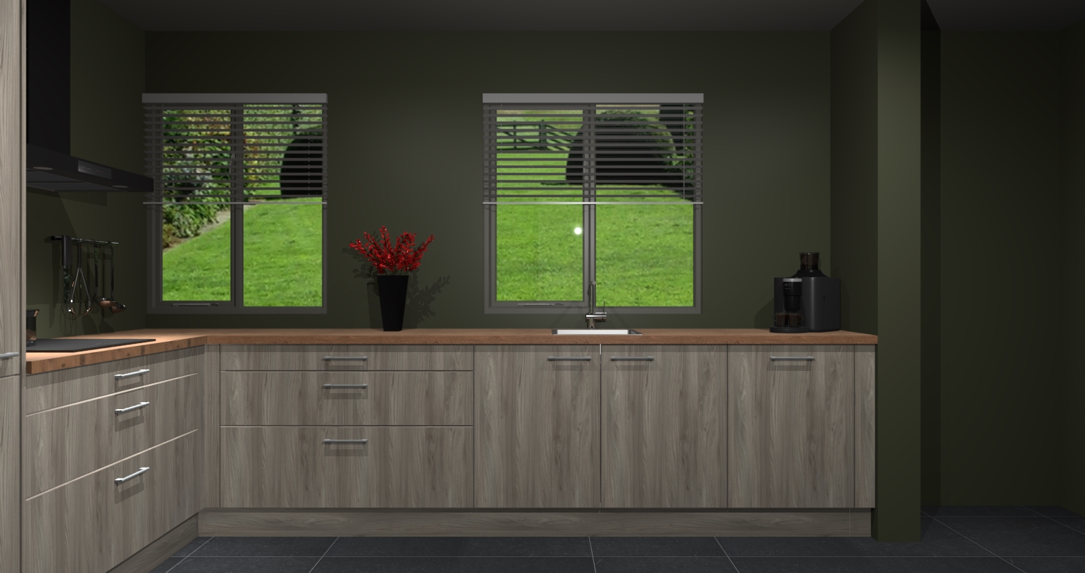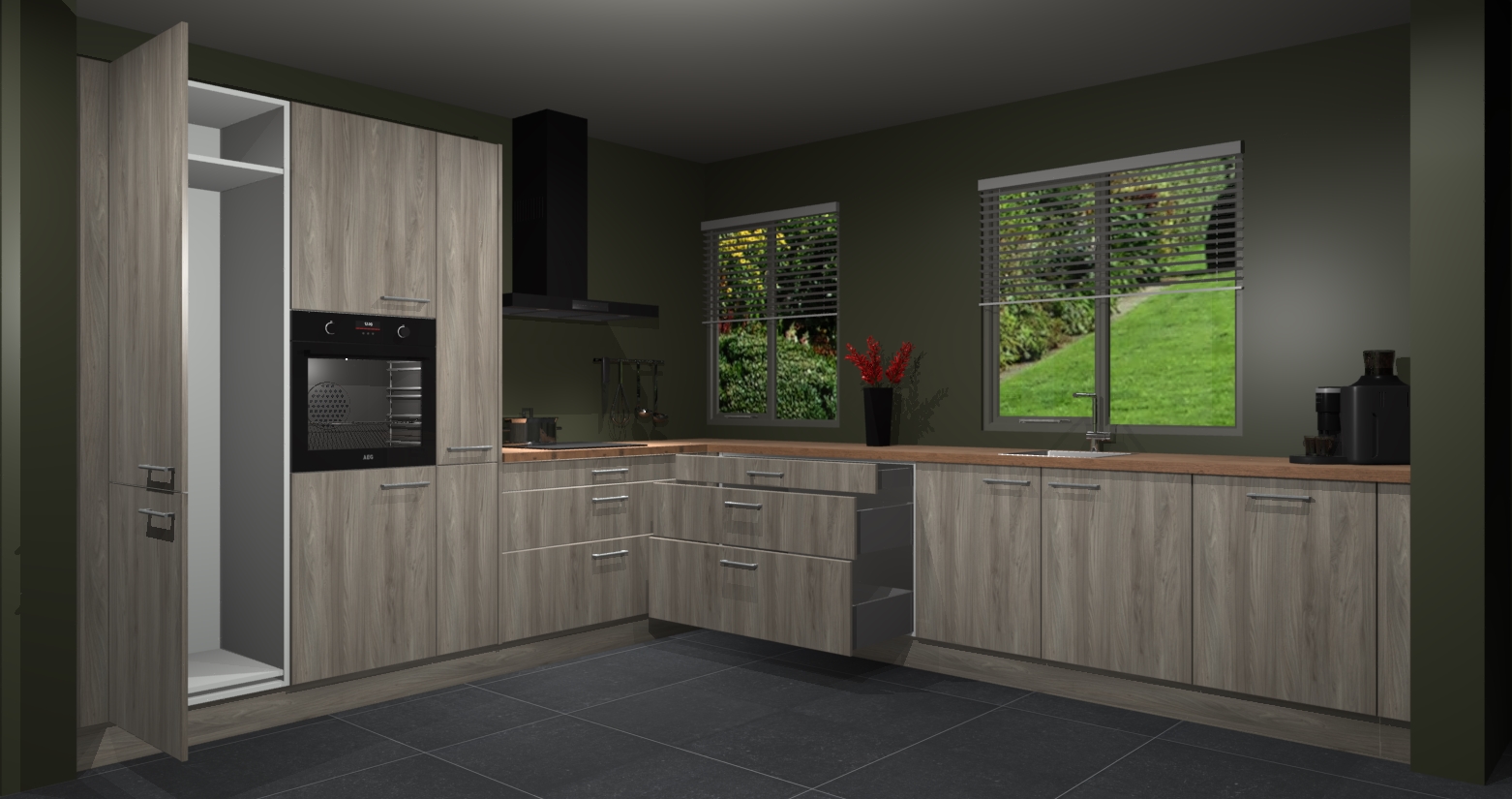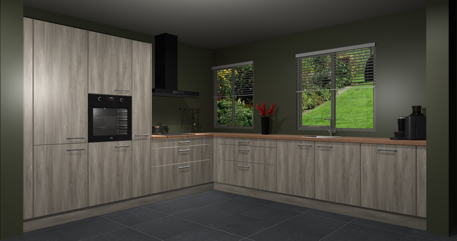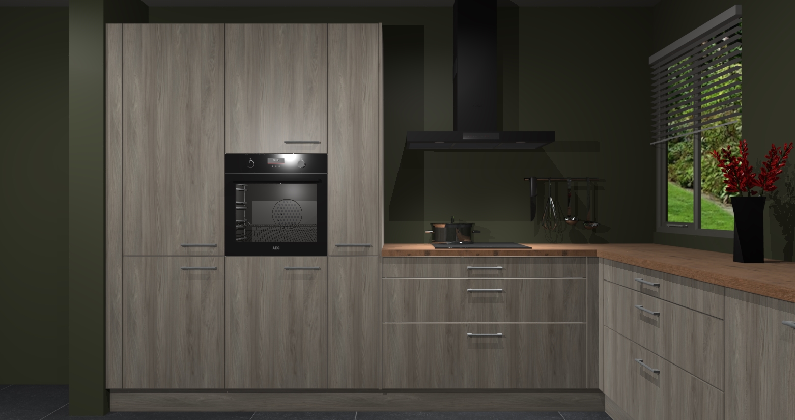 Welkom bij de Vuren keuken Palermo. Deze prachtige keuken zal de komende jaren het middelpunt van de belangstelling in uw huis zijn. Uitgerust met vijf inbouwapparaten komt u nooit kookgereedschap tekort. Bovendien geeft de warme houtlook elke ruimte een uitnodigende en tijdloze uitstraling.