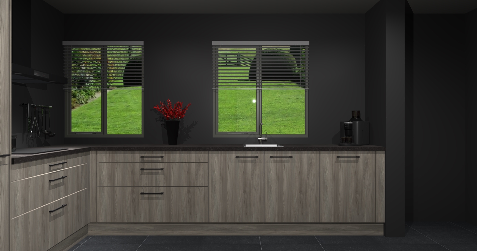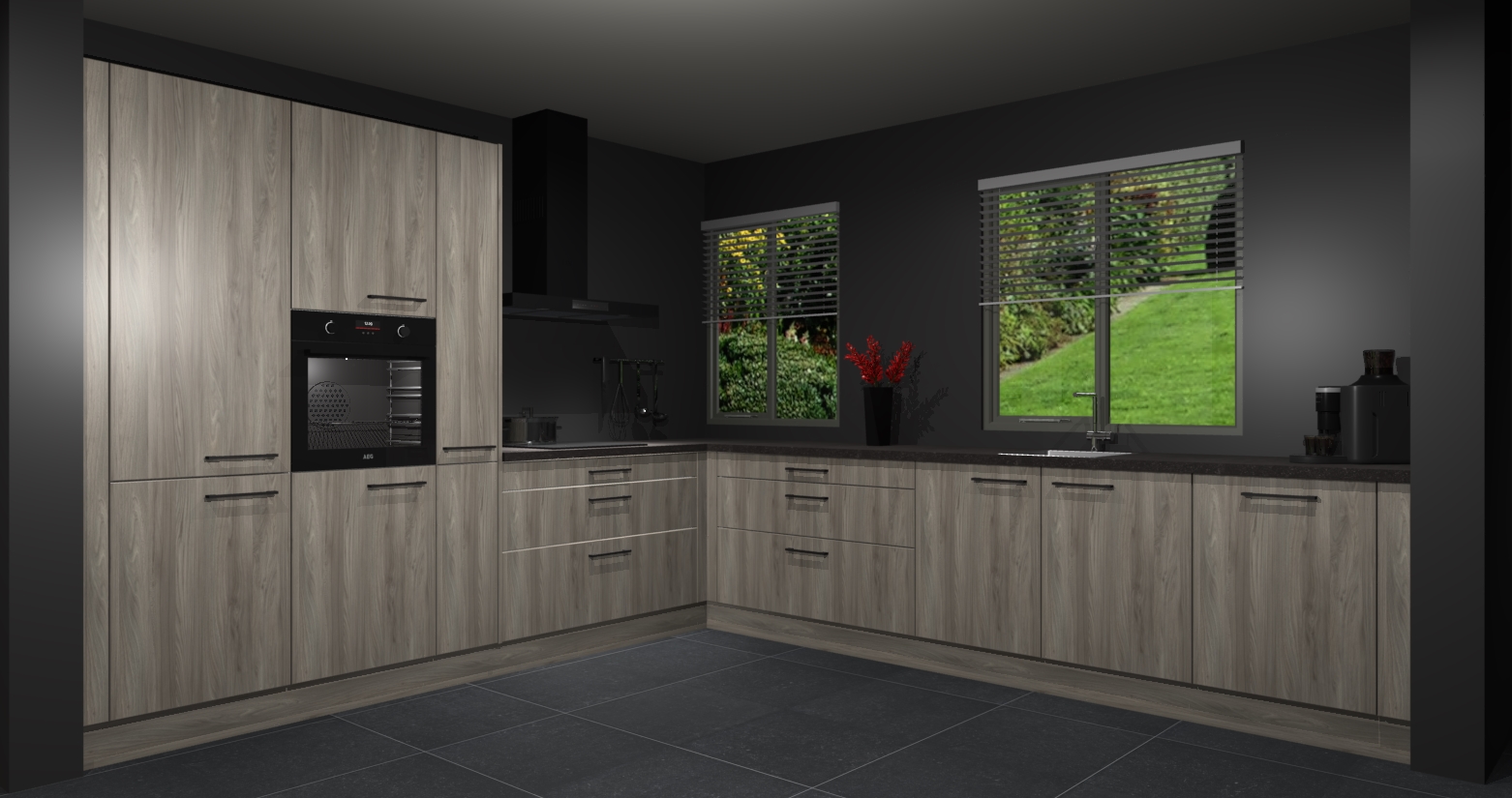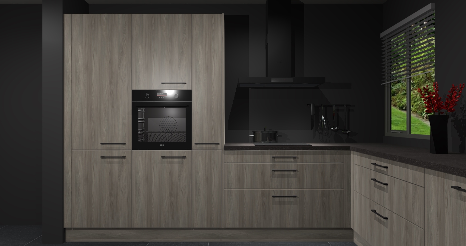 Welkom bij de Vuren keuken Palermo. Deze prachtige keuken zal de komende jaren het middelpunt van de belangstelling in uw huis zijn. Uitgerust met vijf inbouwapparaten komt u nooit kookgereedschap tekort. Bovendien geeft de warme houtlook elke ruimte een uitnodigende en tijdloze uitstraling.