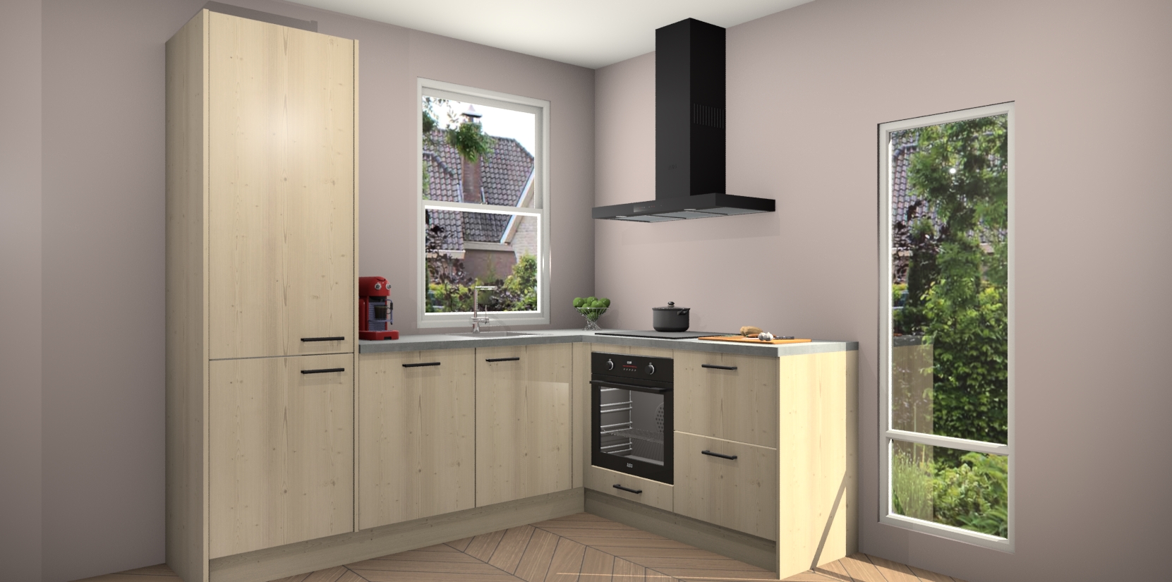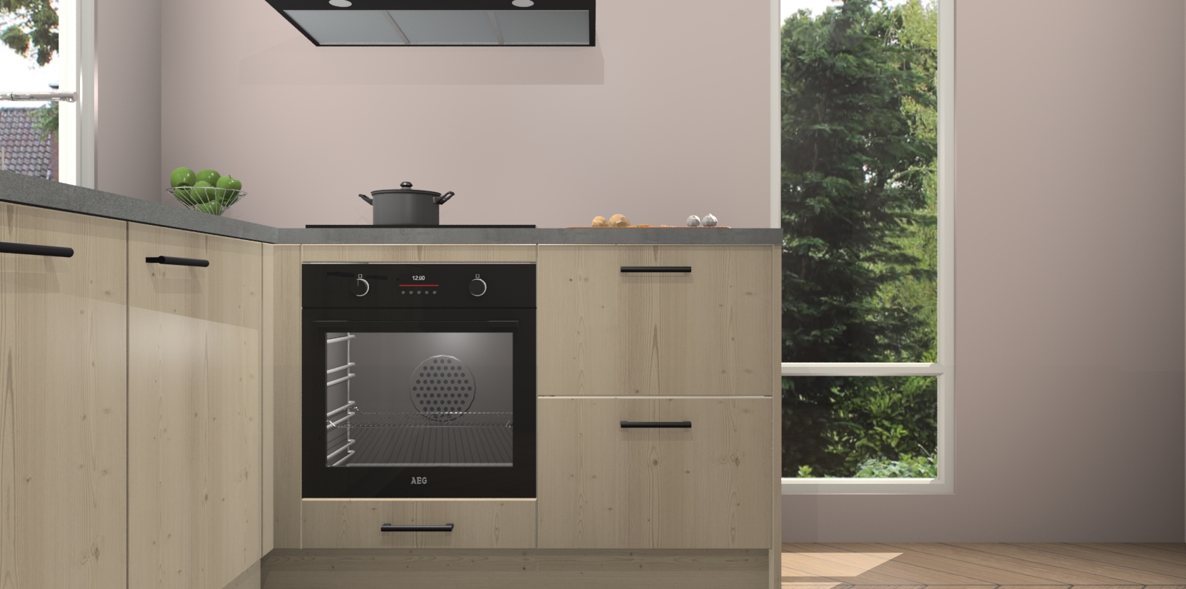 De Vuren keuken Phuket heeft alles wat u maar kunt wensen. Niet alleen zijn er softclose deuren, maar ook 5 ingebouwde apparaten: een oven, inductiekookplaat, afzuigkap, vaatwasser en koelkast - waarbij u later gemakkelijk naar het AEG merk, van inductiekookplaat naar kookplaat met geïntegreerde afzuiging of van oven naar combimagnetron kunt upgraden. Dat alles tegen een vast laag tarief! Bovendien geeft de Vuren keuken Phuket supersnelle levering van 7 weken. Echt iets voor u als u er niet op wilt wachten om het resultaat te zien in eigen keuken!