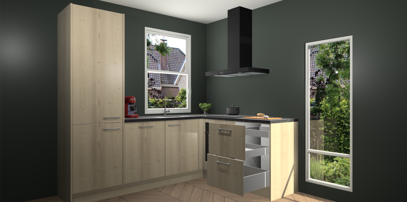 De prachtige Vuren keuken Phuket is de perfecte keuze als u op zoek bent naar een moderne hoekkeuken met alle luxe en comfort die u kunt verwachten! De uitstraling in het houtlook-design draagt bij aan de warme sfeer die u nu al voelt wanneer u er naar kijkt. Heeft u genoeg van ouderwetse keukens? Probeer dan direct deze moderne, mooie hoekkeukens en laat iedereen verbluft achter!