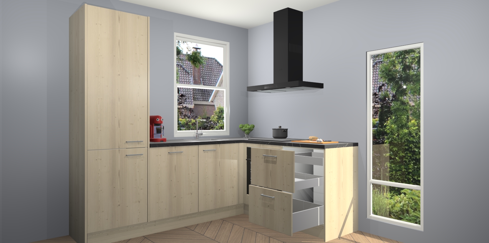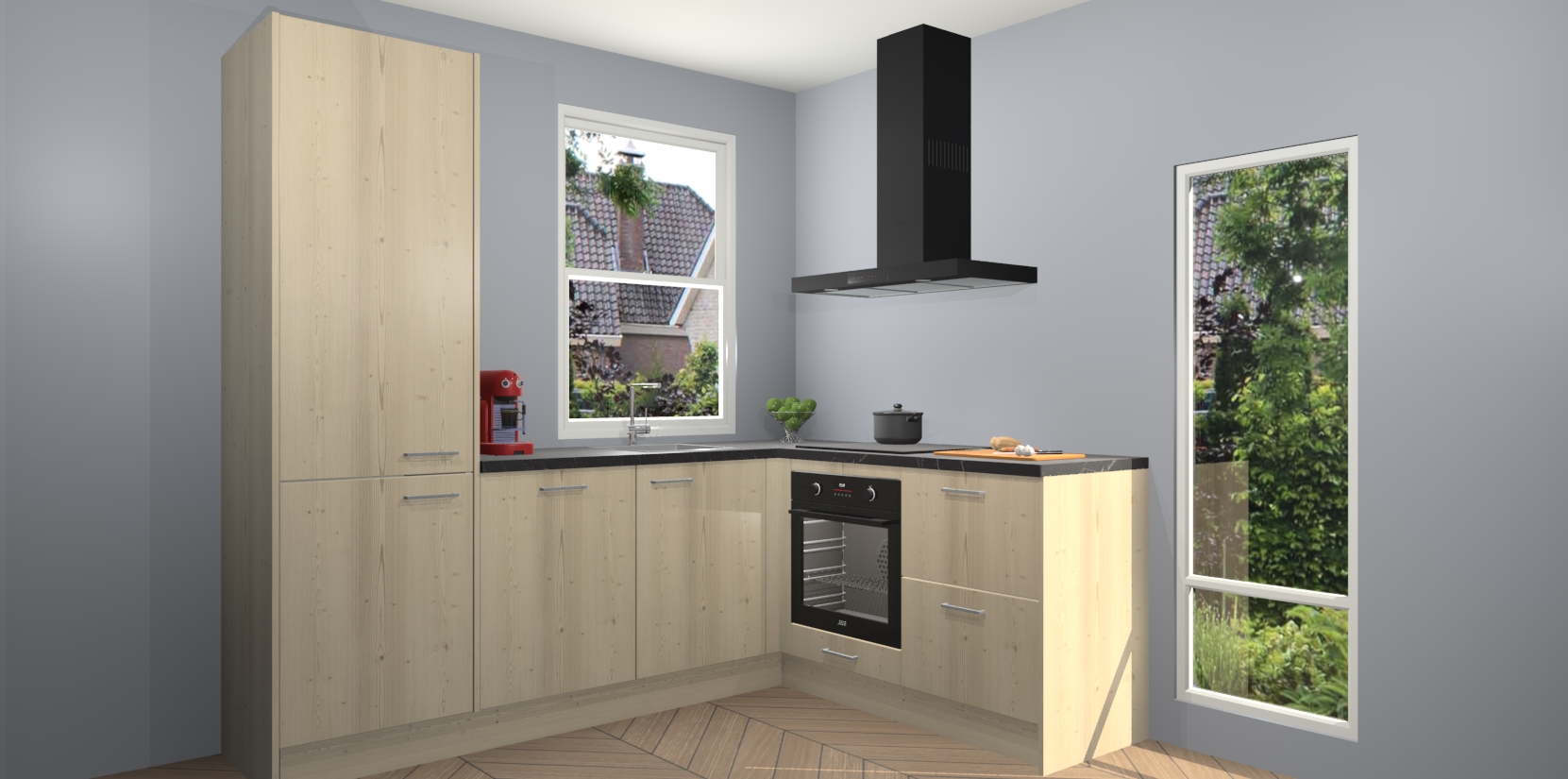 De prachtige Vuren keuken Phuket is de perfecte keuze als u op zoek bent naar een moderne hoekkeuken met alle luxe en comfort die u kunt verwachten! De uitstraling in het houtlook-design draagt bij aan de warme sfeer die u nu al voelt wanneer u er naar kijkt. Heeft u genoeg van ouderwetse keukens? Probeer dan direct deze moderne, mooie hoekkeukens en laat iedereen verbluft achter!