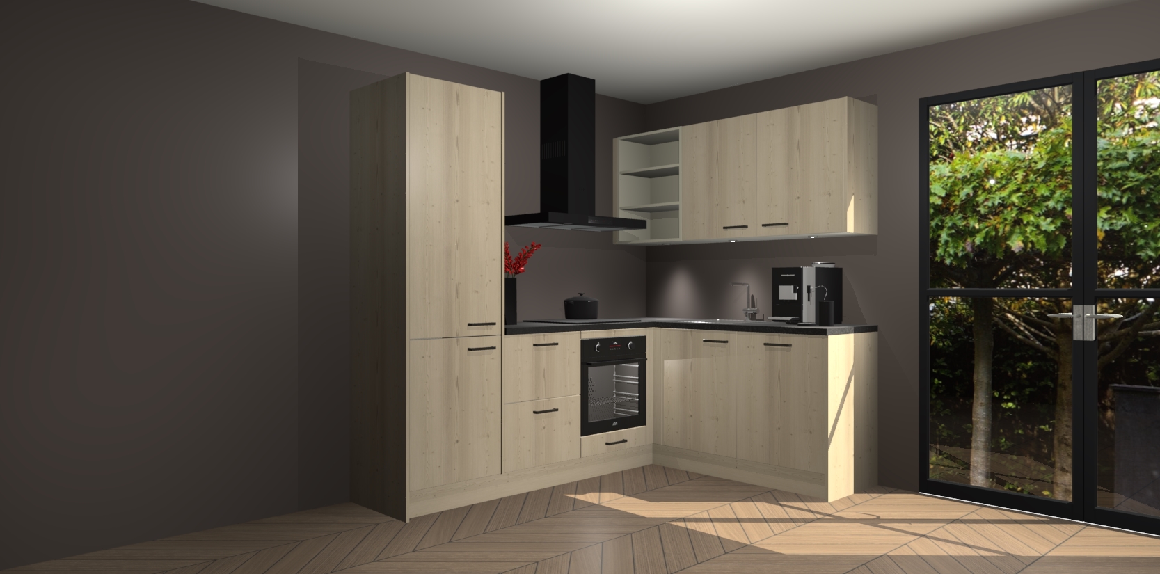 Wauw, dit is de Vuren keuken Pilsen! U kunt gerust zeggen dat u elegantie combineert met functionaliteit met deze keuken. Met een modern en chique ontwerp is de keuken precies wat u nodig heeft om uw ruimte te verfraaien. De binnenzijde van de kasten is in dezelfde donkere kleur als de buitenzijde voor een uniforme look, compleet met softclose-kasten die stil sluiten.