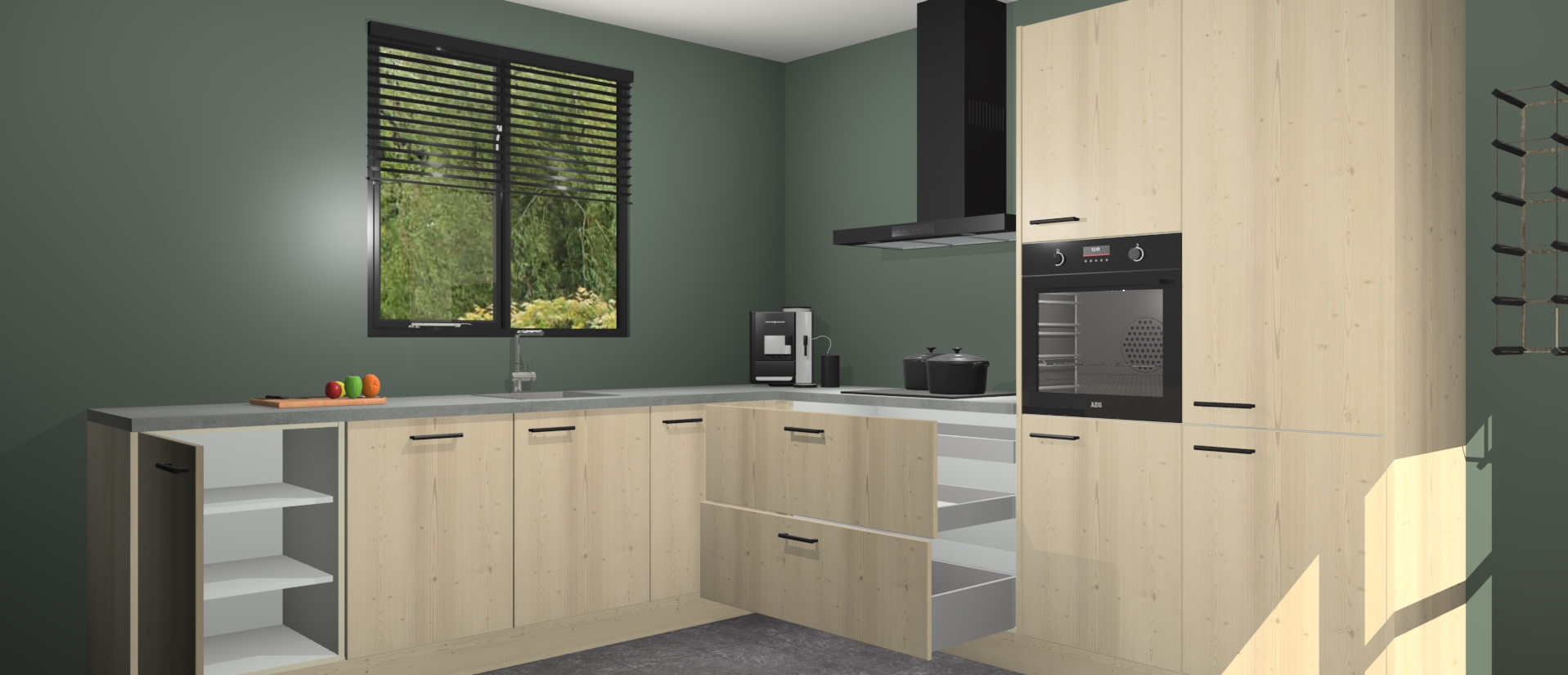De Vuren keuken Porto heeft 5 ingebouwde apparaten - een oven, inductiekookplaat, afzuigkap, vaatwasser en koelkast - waarmee u in een handomdraai heerlijke gerechten bereidt. Soft-close deuren zorgen voor nog meer functionaliteit en gemak. En dit alles voor een onverslaanbaar vaste prijs. En als u nu bestelt, duurt de levering maar 7 weken! Wat nog ongelooflijker is, is dat onze kasten voor gemonteerd worden geleverd.