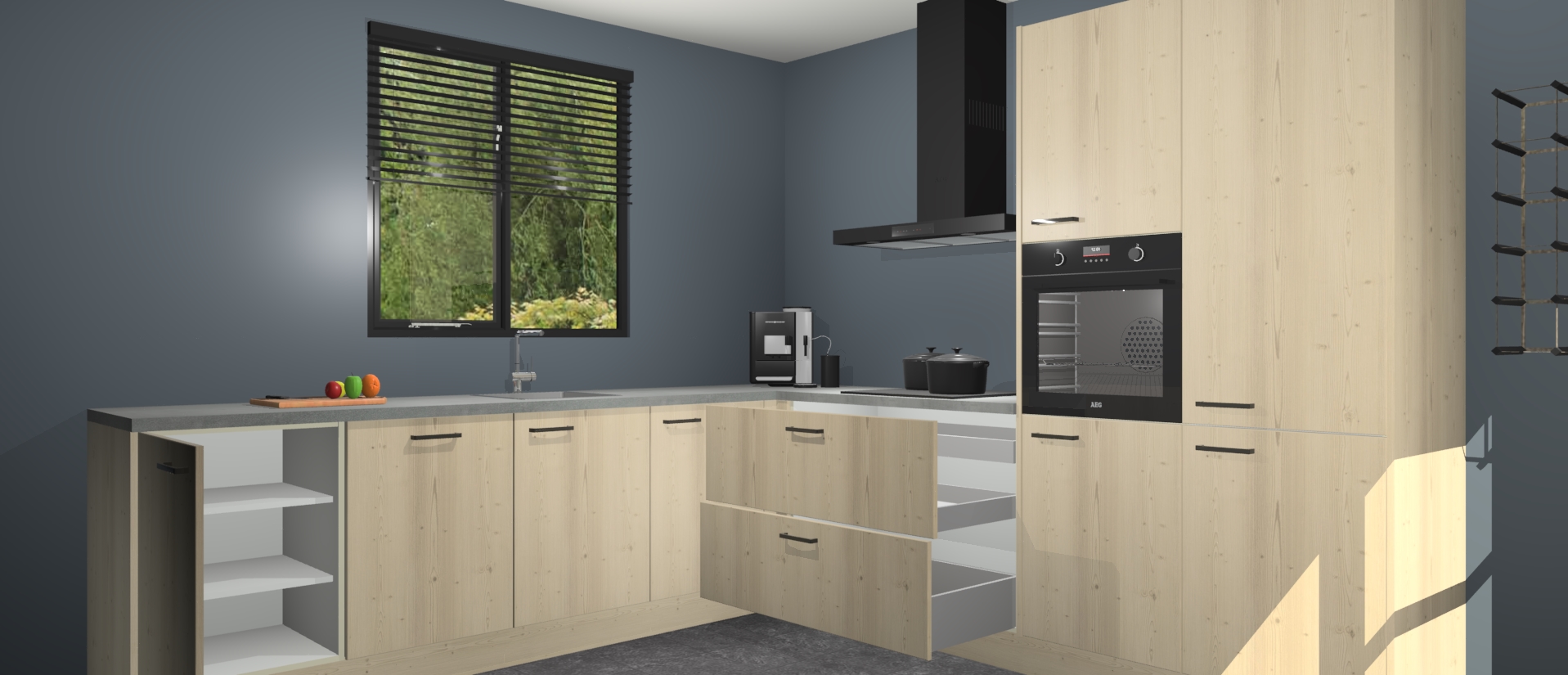 De Vuren keuken Porto heeft 5 ingebouwde apparaten - een oven, inductiekookplaat, afzuigkap, vaatwasser en koelkast - waarmee u in een handomdraai heerlijke gerechten bereidt. Soft-close deuren zorgen voor nog meer functionaliteit en gemak. En dit alles voor een onverslaanbaar vaste prijs. En als u nu bestelt, duurt de levering maar 7 weken! Wat nog ongelooflijker is, is dat onze kasten voor gemonteerd worden geleverd.