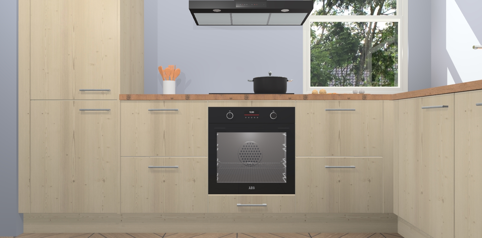 Wat maakt deze keuken zo bijzonder? Ten eerste geeft het houten werkblad uw ruimte een onmiskenbaar klassieke uitstraling. De natuurlijke afwerking roept warmte en elegantie op die nooit uit de mode zullen raken. Bovendien is het gemakkelijk schoon te houden en te onderhouden, zodat je er jarenlang plezier van kunt hebben. Als u op zoek bent naar extra gemak in uw keuken, dan heeft u bij het plaatsen van een bestelling bij ons ook de optie om uw toestellen te upgraden naar AEG-modellen - zo haalt u moderne innovatie van topmerken in apparatentechnologie rechtstreeks in huis.