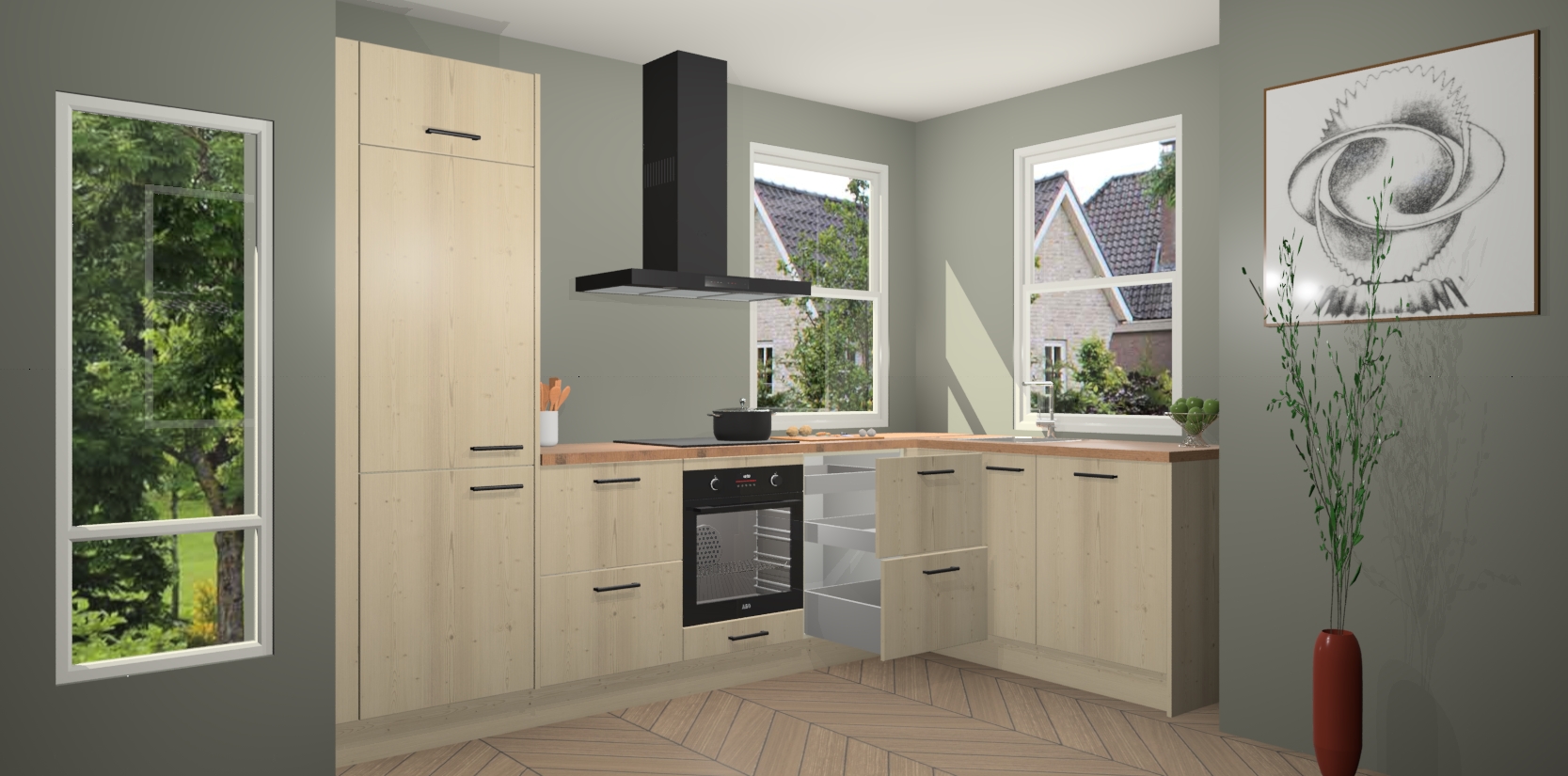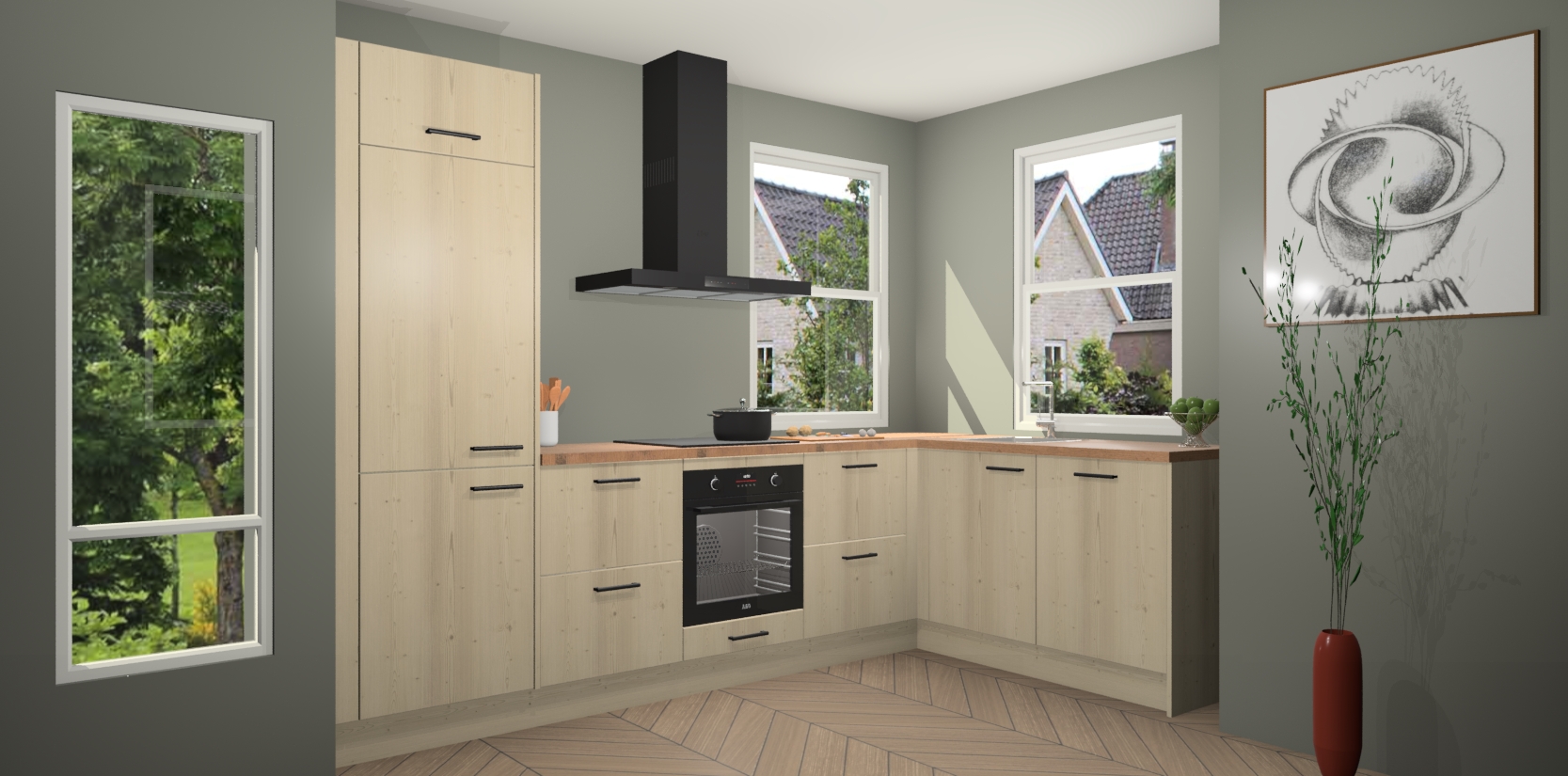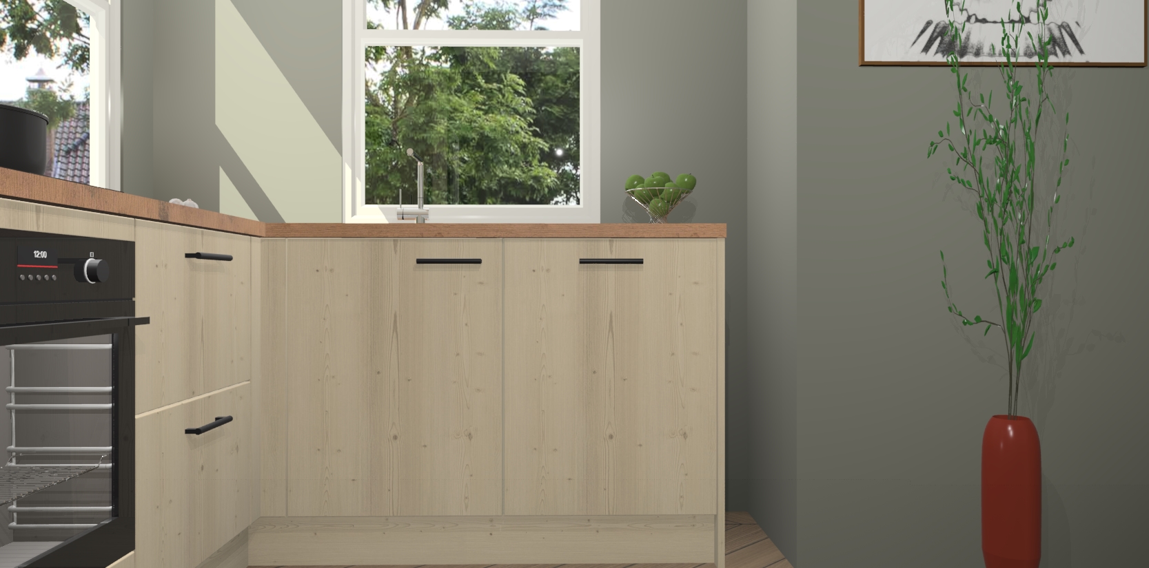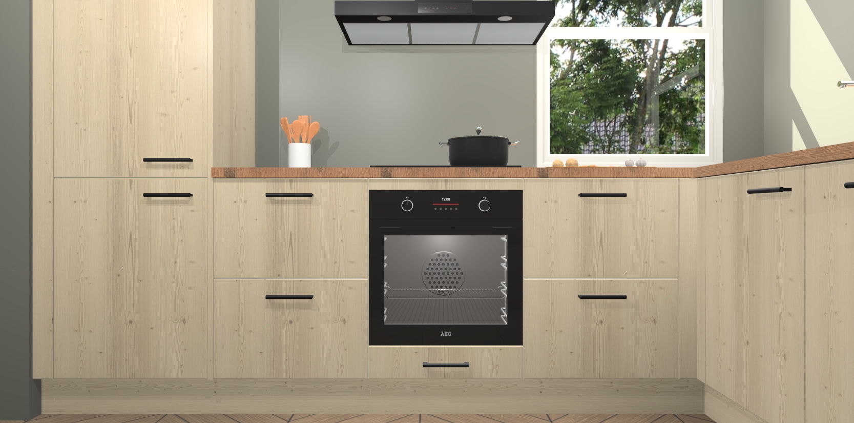 Wat maakt deze keuken zo bijzonder? Ten eerste geeft het houten werkblad uw ruimte een onmiskenbaar klassieke uitstraling. De natuurlijke afwerking roept warmte en elegantie op die nooit uit de mode zullen raken. Bovendien is het gemakkelijk schoon te houden en te onderhouden, zodat je er jarenlang plezier van kunt hebben. Als u op zoek bent naar extra gemak in uw keuken, dan heeft u bij het plaatsen van een bestelling bij ons ook de optie om uw toestellen te upgraden naar AEG-modellen - zo haalt u moderne innovatie van topmerken in apparatentechnologie rechtstreeks in huis.