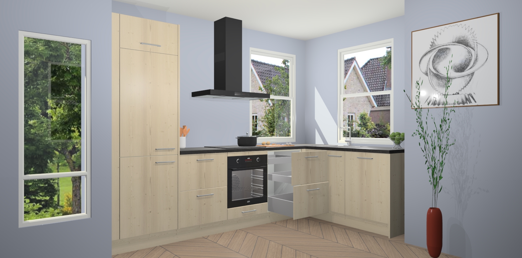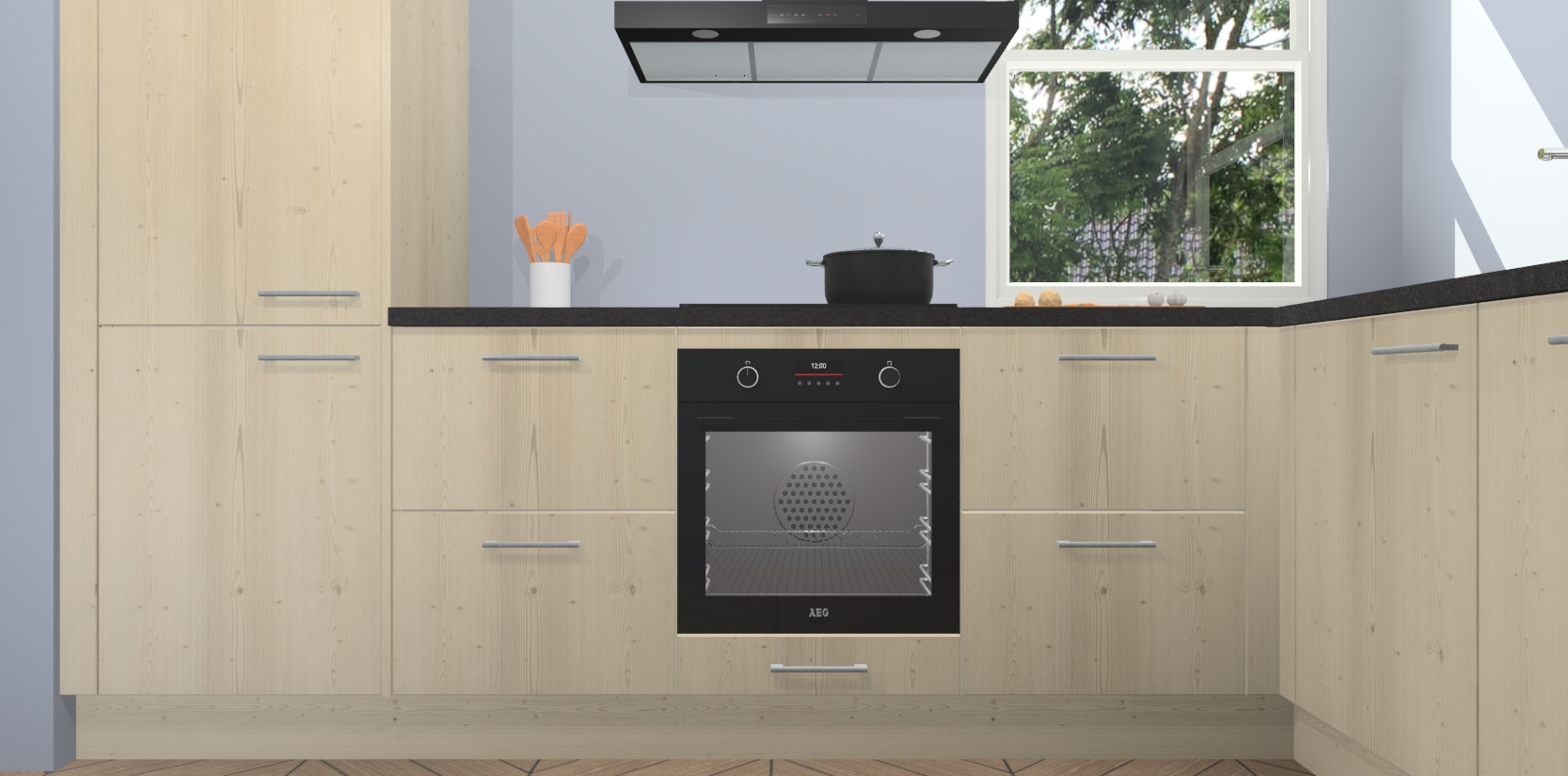Wat maakt deze keuken zo bijzonder? Ten eerste geeft het houten werkblad uw ruimte een onmiskenbaar klassieke uitstraling. De natuurlijke afwerking roept warmte en elegantie op die nooit uit de mode zullen raken. Bovendien is het gemakkelijk schoon te houden en te onderhouden, zodat je er jarenlang plezier van kunt hebben. Als u op zoek bent naar extra gemak in uw keuken, dan heeft u bij het plaatsen van een bestelling bij ons ook de optie om uw toestellen te upgraden naar AEG-modellen - zo haalt u moderne innovatie van topmerken in apparatentechnologie rechtstreeks in huis.