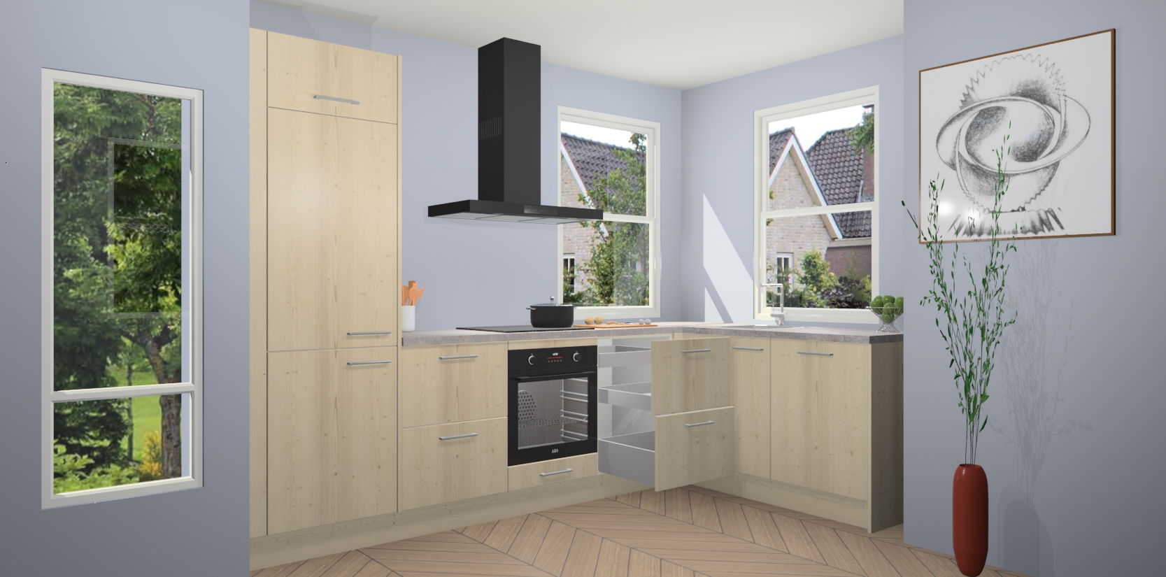 Wat maakt deze keuken zo bijzonder? Ten eerste geeft het houten werkblad uw ruimte een onmiskenbaar klassieke uitstraling. De natuurlijke afwerking roept warmte en elegantie op die nooit uit de mode zullen raken. Bovendien is het gemakkelijk schoon te houden en te onderhouden, zodat je er jarenlang plezier van kunt hebben. Als u op zoek bent naar extra gemak in uw keuken, dan heeft u bij het plaatsen van een bestelling bij ons ook de optie om uw toestellen te upgraden naar AEG-modellen - zo haalt u moderne innovatie van topmerken in apparatentechnologie rechtstreeks in huis.