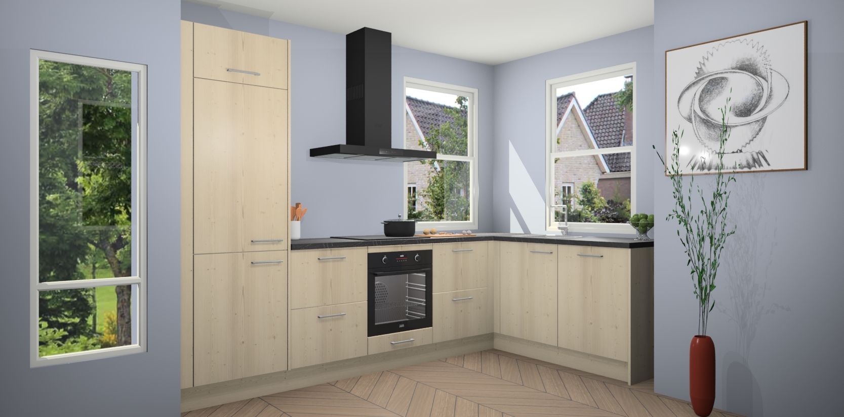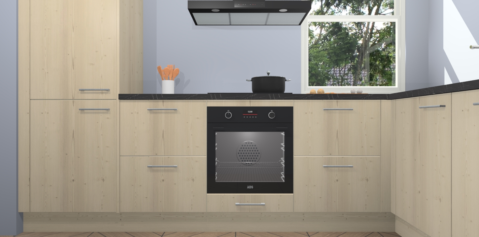 Wat maakt deze keuken zo bijzonder? Ten eerste geeft het houten werkblad uw ruimte een onmiskenbaar klassieke uitstraling. De natuurlijke afwerking roept warmte en elegantie op die nooit uit de mode zullen raken. Bovendien is het gemakkelijk schoon te houden en te onderhouden, zodat je er jarenlang plezier van kunt hebben. Als u op zoek bent naar extra gemak in uw keuken, dan heeft u bij het plaatsen van een bestelling bij ons ook de optie om uw toestellen te upgraden naar AEG-modellen - zo haalt u moderne innovatie van topmerken in apparatentechnologie rechtstreeks in huis.