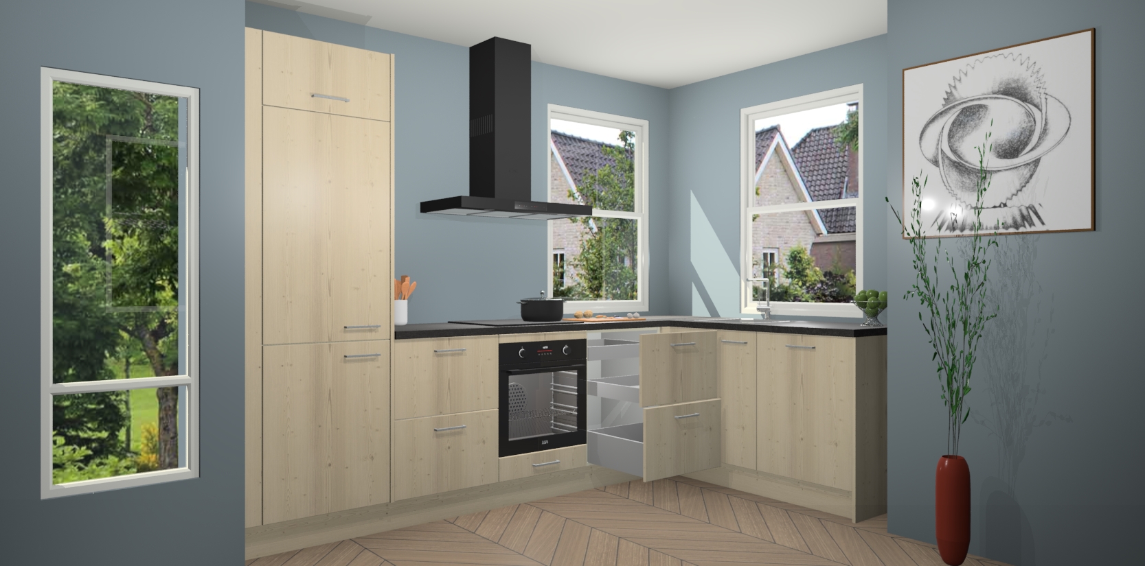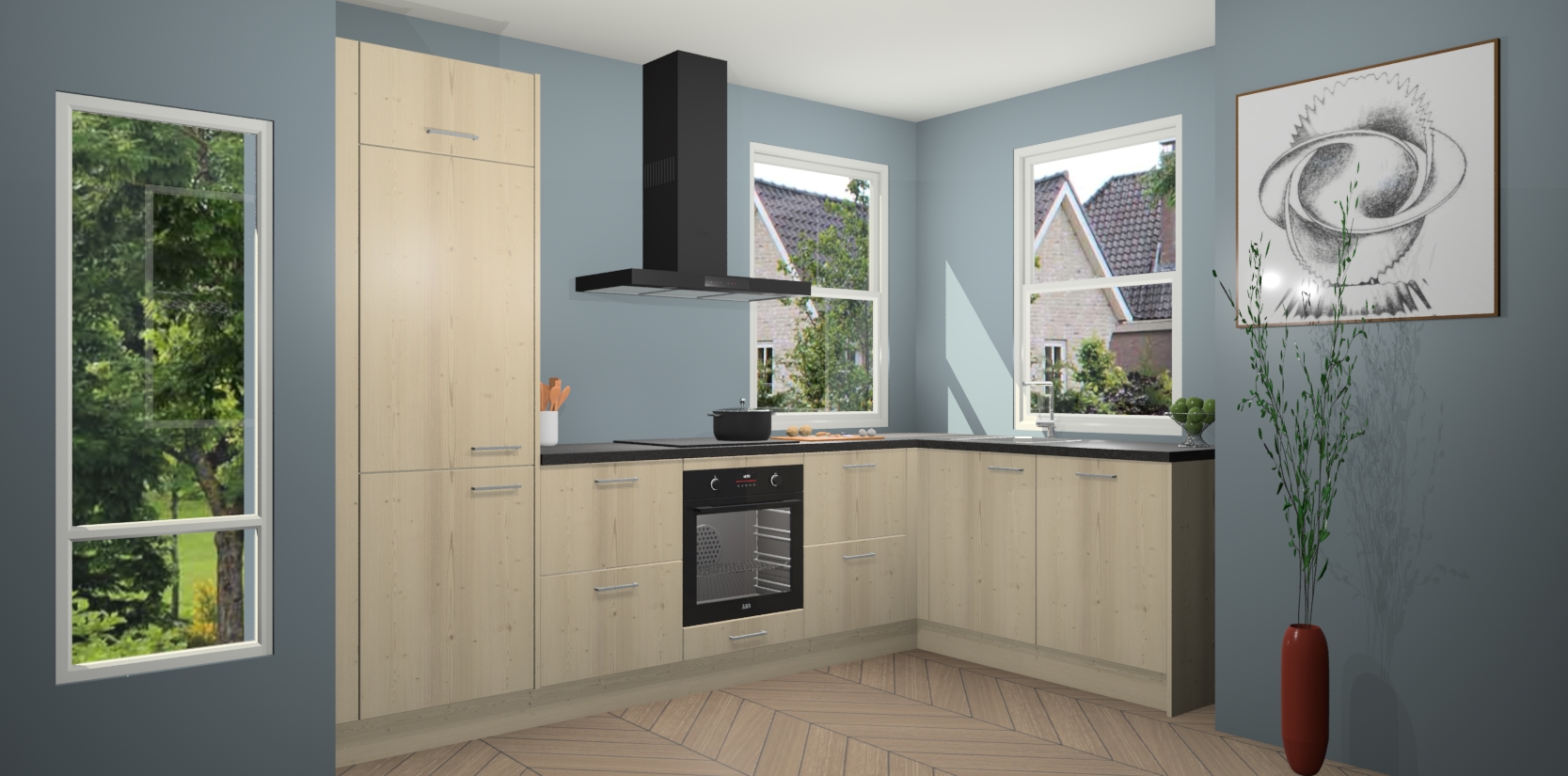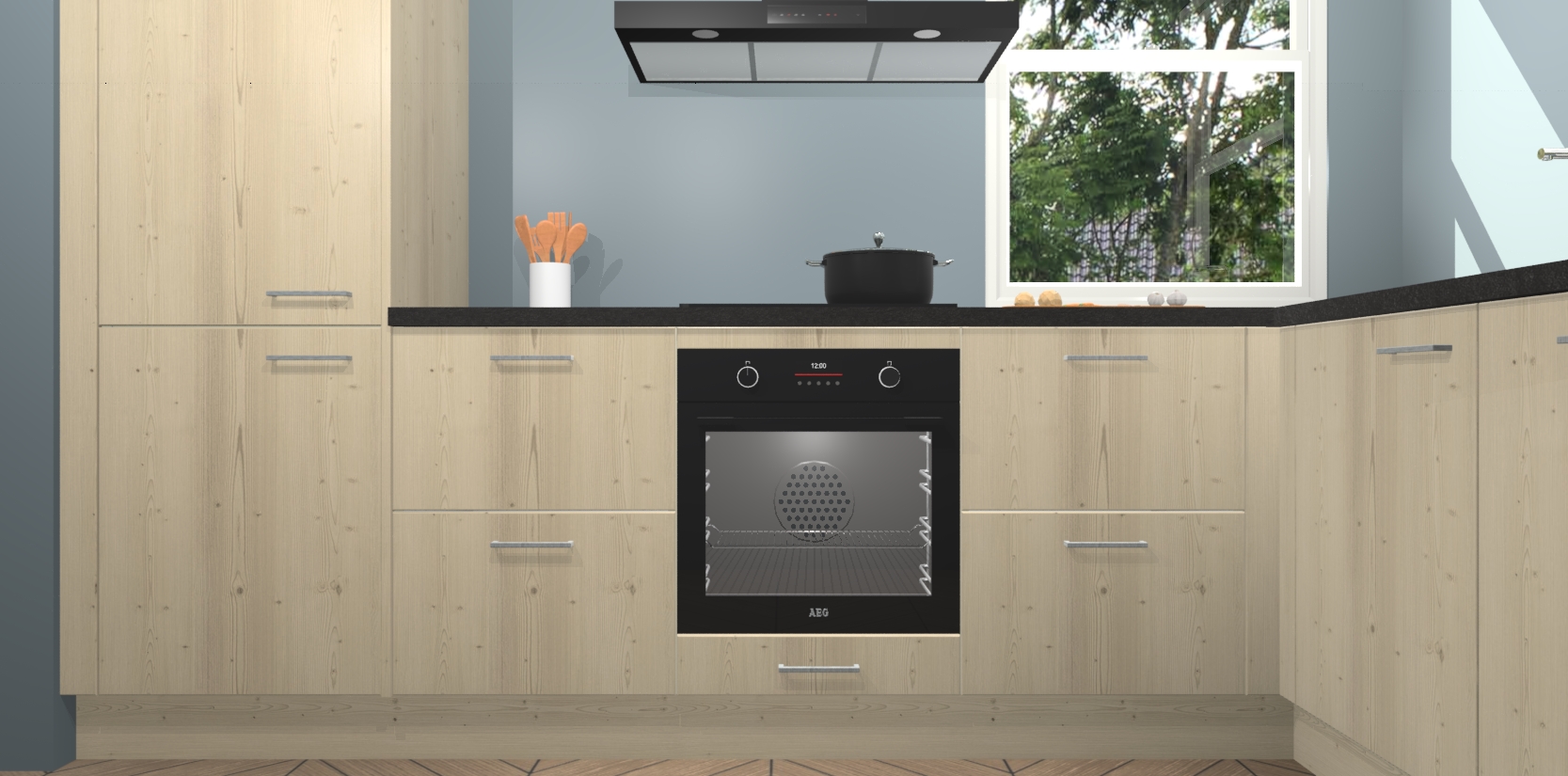 Wat maakt deze keuken zo bijzonder? Ten eerste geeft het houten werkblad uw ruimte een onmiskenbaar klassieke uitstraling. De natuurlijke afwerking roept warmte en elegantie op die nooit uit de mode zullen raken. Bovendien is het gemakkelijk schoon te houden en te onderhouden, zodat je er jarenlang plezier van kunt hebben. Als u op zoek bent naar extra gemak in uw keuken, dan heeft u bij het plaatsen van een bestelling bij ons ook de optie om uw toestellen te upgraden naar AEG-modellen - zo haalt u moderne innovatie van topmerken in apparatentechnologie rechtstreeks in huis.