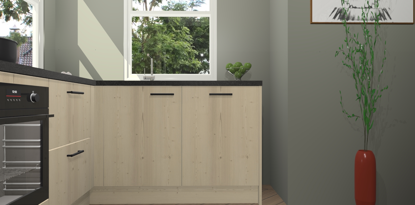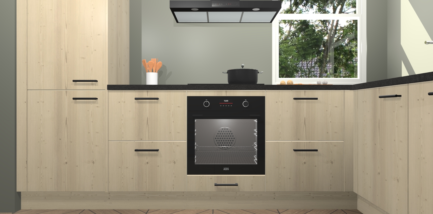 Wat maakt deze keuken zo bijzonder? Ten eerste geeft het houten werkblad uw ruimte een onmiskenbaar klassieke uitstraling. De natuurlijke afwerking roept warmte en elegantie op die nooit uit de mode zullen raken. Bovendien is het gemakkelijk schoon te houden en te onderhouden, zodat je er jarenlang plezier van kunt hebben. Als u op zoek bent naar extra gemak in uw keuken, dan heeft u bij het plaatsen van een bestelling bij ons ook de optie om uw toestellen te upgraden naar AEG-modellen - zo haalt u moderne innovatie van topmerken in apparatentechnologie rechtstreeks in huis.