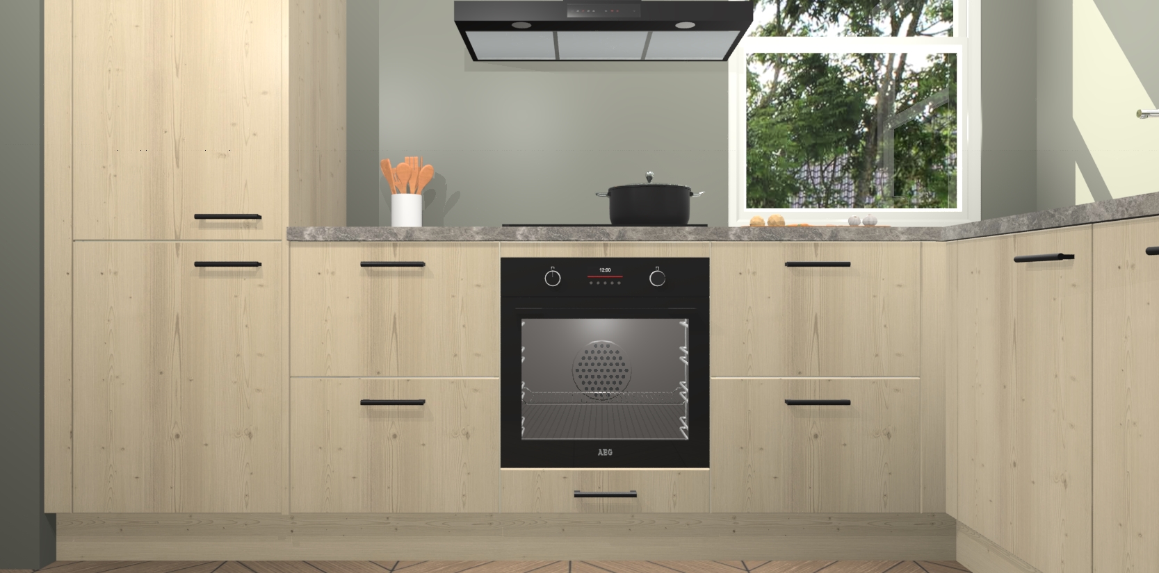 Wat maakt deze keuken zo bijzonder? Ten eerste geeft het houten werkblad uw ruimte een onmiskenbaar klassieke uitstraling. De natuurlijke afwerking roept warmte en elegantie op die nooit uit de mode zullen raken. Bovendien is het gemakkelijk schoon te houden en te onderhouden, zodat je er jarenlang plezier van kunt hebben. Als u op zoek bent naar extra gemak in uw keuken, dan heeft u bij het plaatsen van een bestelling bij ons ook de optie om uw toestellen te upgraden naar AEG-modellen - zo haalt u moderne innovatie van topmerken in apparatentechnologie rechtstreeks in huis.
