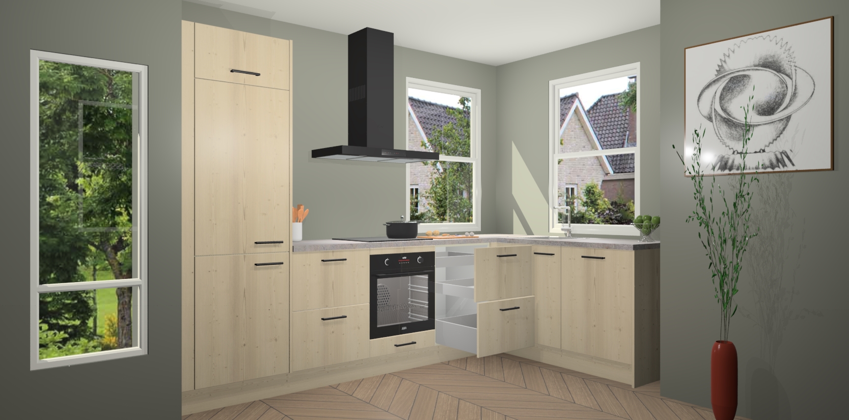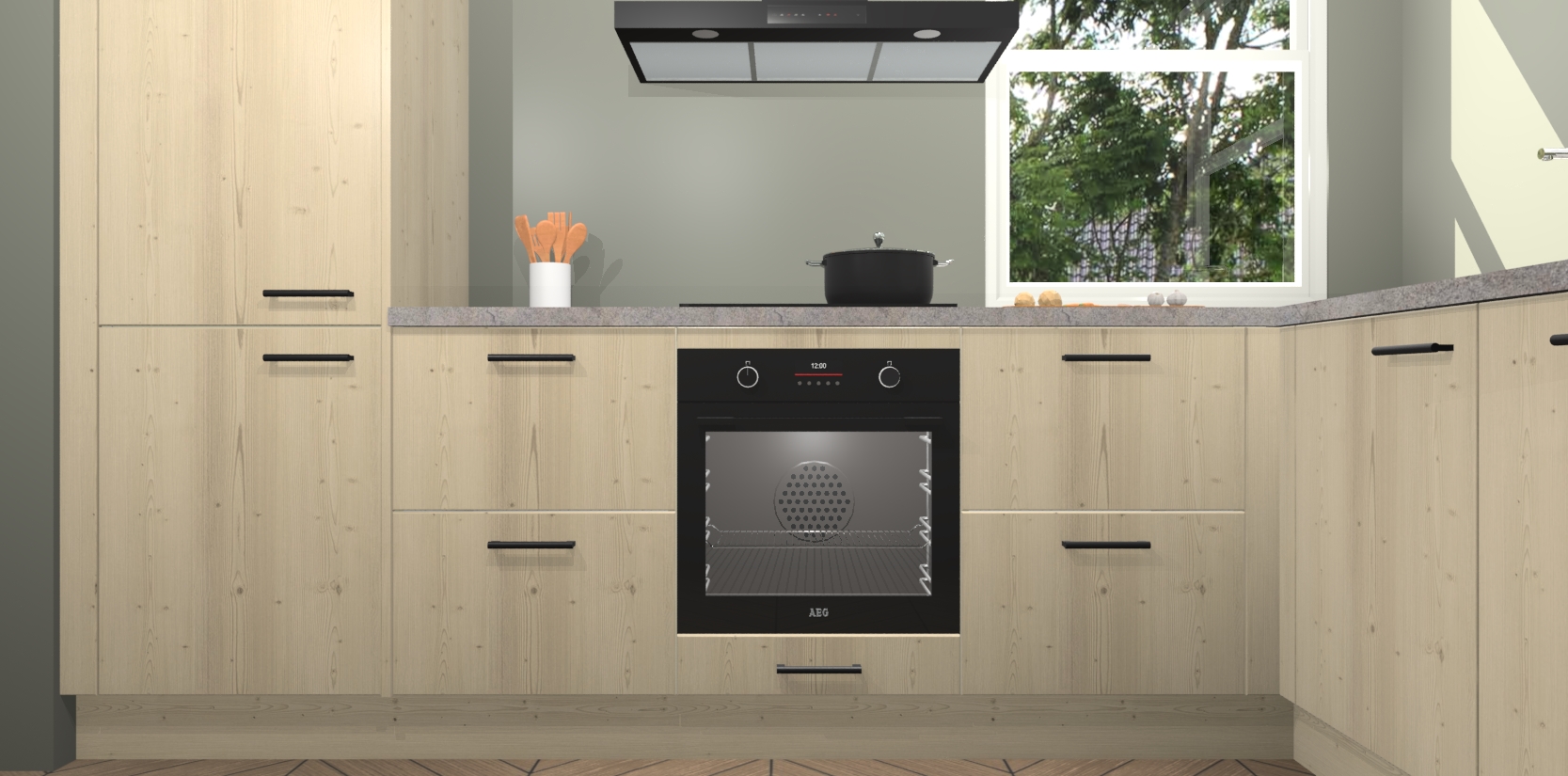 Wat maakt deze keuken zo bijzonder? Ten eerste geeft het houten werkblad uw ruimte een onmiskenbaar klassieke uitstraling. De natuurlijke afwerking roept warmte en elegantie op die nooit uit de mode zullen raken. Bovendien is het gemakkelijk schoon te houden en te onderhouden, zodat je er jarenlang plezier van kunt hebben. Als u op zoek bent naar extra gemak in uw keuken, dan heeft u bij het plaatsen van een bestelling bij ons ook de optie om uw toestellen te upgraden naar AEG-modellen - zo haalt u moderne innovatie van topmerken in apparatentechnologie rechtstreeks in huis.