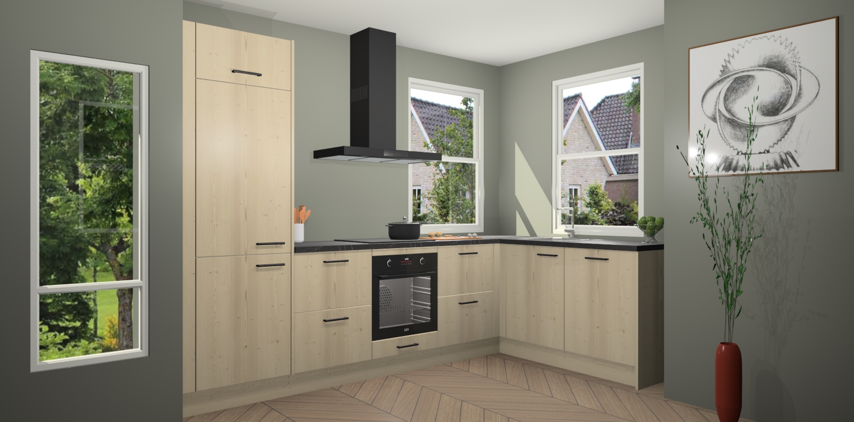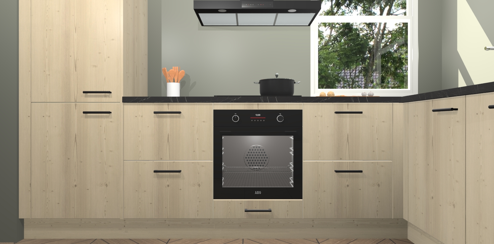 Wat maakt deze keuken zo bijzonder? Ten eerste geeft het houten werkblad uw ruimte een onmiskenbaar klassieke uitstraling. De natuurlijke afwerking roept warmte en elegantie op die nooit uit de mode zullen raken. Bovendien is het gemakkelijk schoon te houden en te onderhouden, zodat je er jarenlang plezier van kunt hebben. Als u op zoek bent naar extra gemak in uw keuken, dan heeft u bij het plaatsen van een bestelling bij ons ook de optie om uw toestellen te upgraden naar AEG-modellen - zo haalt u moderne innovatie van topmerken in apparatentechnologie rechtstreeks in huis.