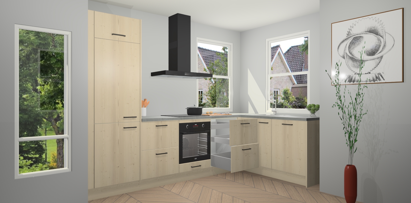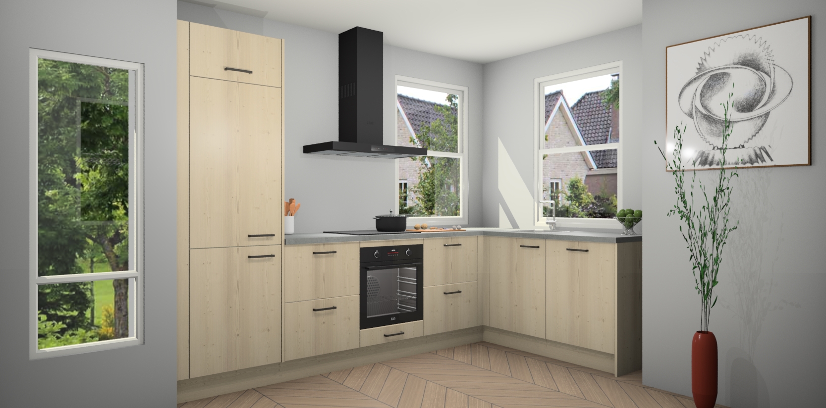 Wat maakt deze keuken zo bijzonder? Ten eerste geeft het houten werkblad uw ruimte een onmiskenbaar klassieke uitstraling. De natuurlijke afwerking roept warmte en elegantie op die nooit uit de mode zullen raken. Bovendien is het gemakkelijk schoon te houden en te onderhouden, zodat je er jarenlang plezier van kunt hebben. Als u op zoek bent naar extra gemak in uw keuken, dan heeft u bij het plaatsen van een bestelling bij ons ook de optie om uw toestellen te upgraden naar AEG-modellen - zo haalt u moderne innovatie van topmerken in apparatentechnologie rechtstreeks in huis.