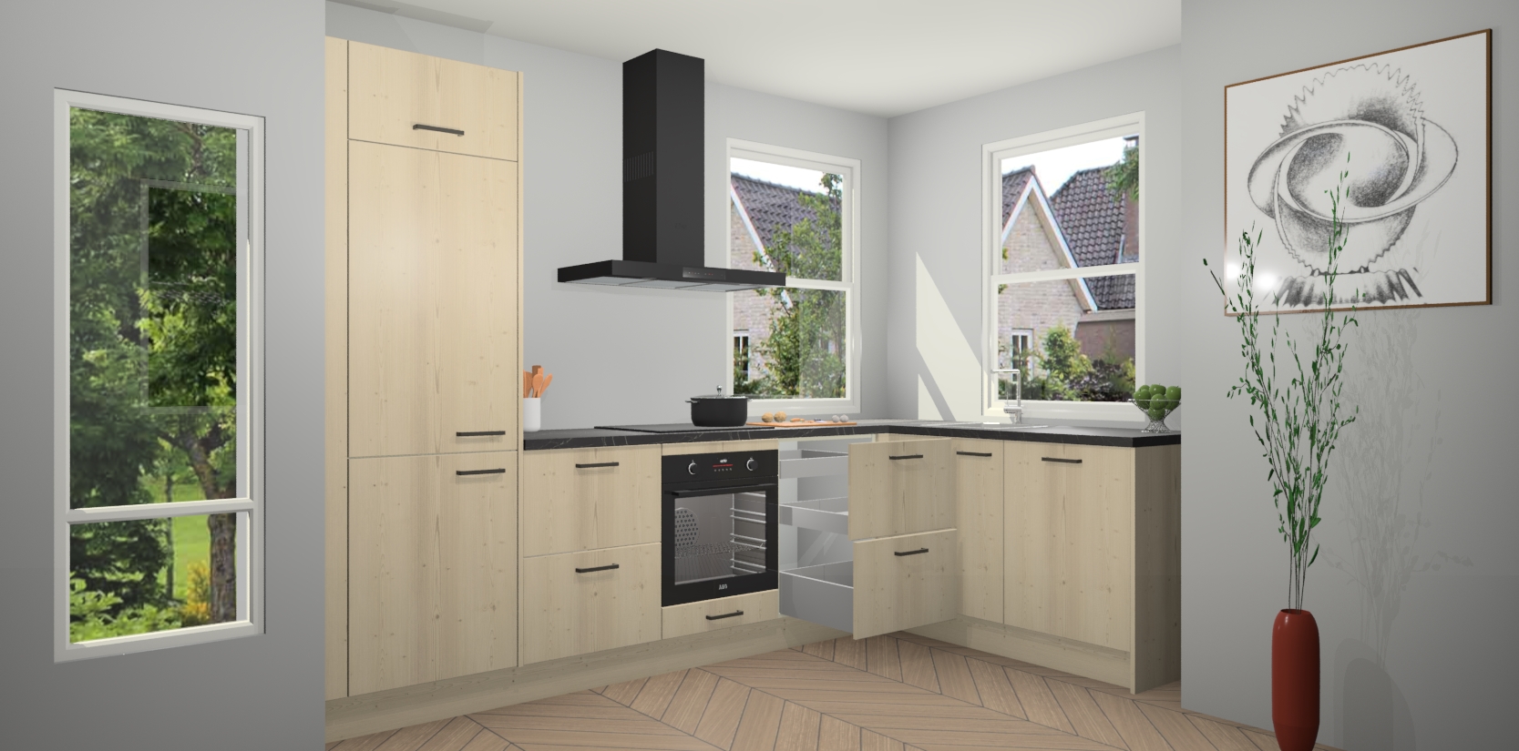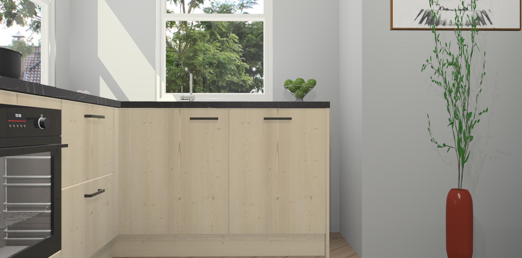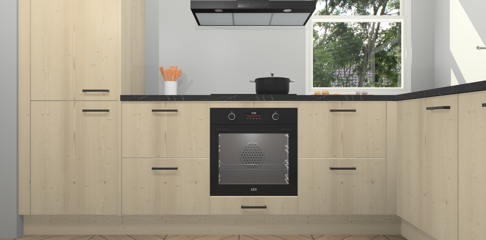 Wat maakt deze keuken zo bijzonder? Ten eerste geeft het houten werkblad uw ruimte een onmiskenbaar klassieke uitstraling. De natuurlijke afwerking roept warmte en elegantie op die nooit uit de mode zullen raken. Bovendien is het gemakkelijk schoon te houden en te onderhouden, zodat je er jarenlang plezier van kunt hebben. Als u op zoek bent naar extra gemak in uw keuken, dan heeft u bij het plaatsen van een bestelling bij ons ook de optie om uw toestellen te upgraden naar AEG-modellen - zo haalt u moderne innovatie van topmerken in apparatentechnologie rechtstreeks in huis.